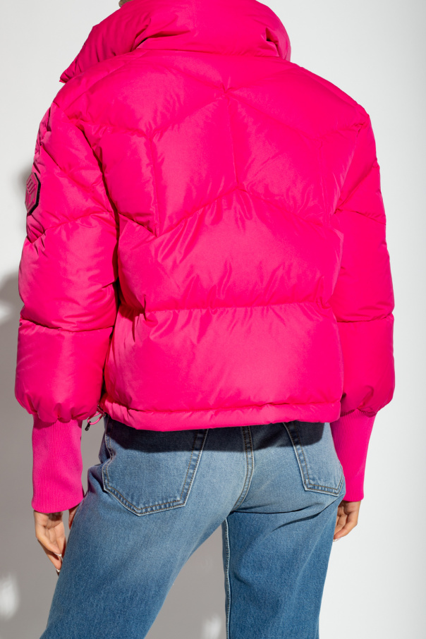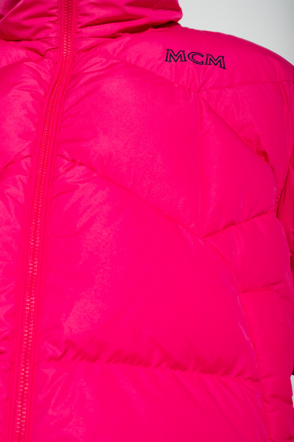 Pink cropped down jacket from MCM. Fastened with a zip, this garment features a black logo embroidery, Cubic patch with velcro fastening, two snap-fastened front pockets, drawstring hem and ribbed cuffs.