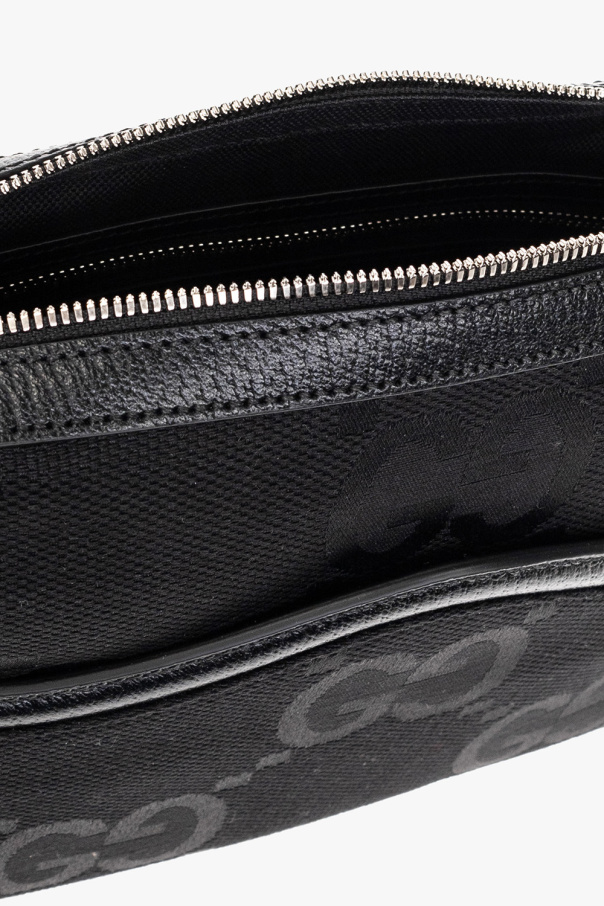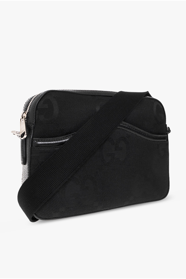 Black shoulder bag from Gucci. Made of canvas with a monogram pattern and calf leather trims, this model is complete with a zip fastening, snap-fastened front pocket, detachable and adjustable strap, silver-tone metal hardware and one internal compartment with one zip pocket.