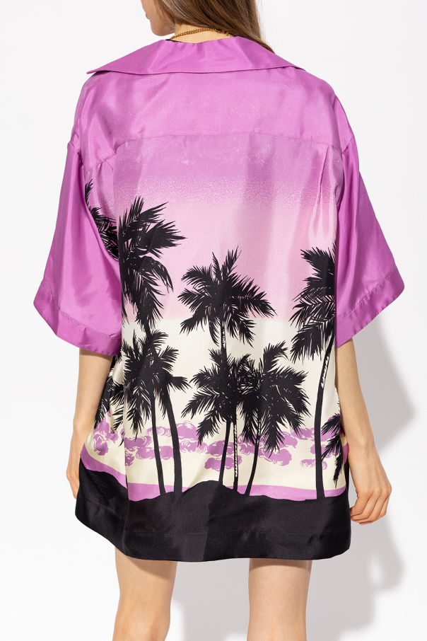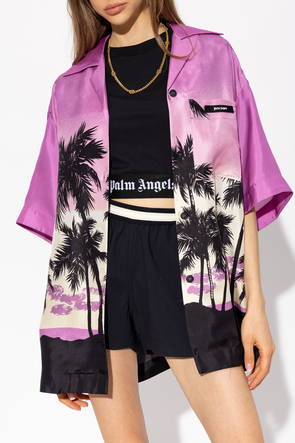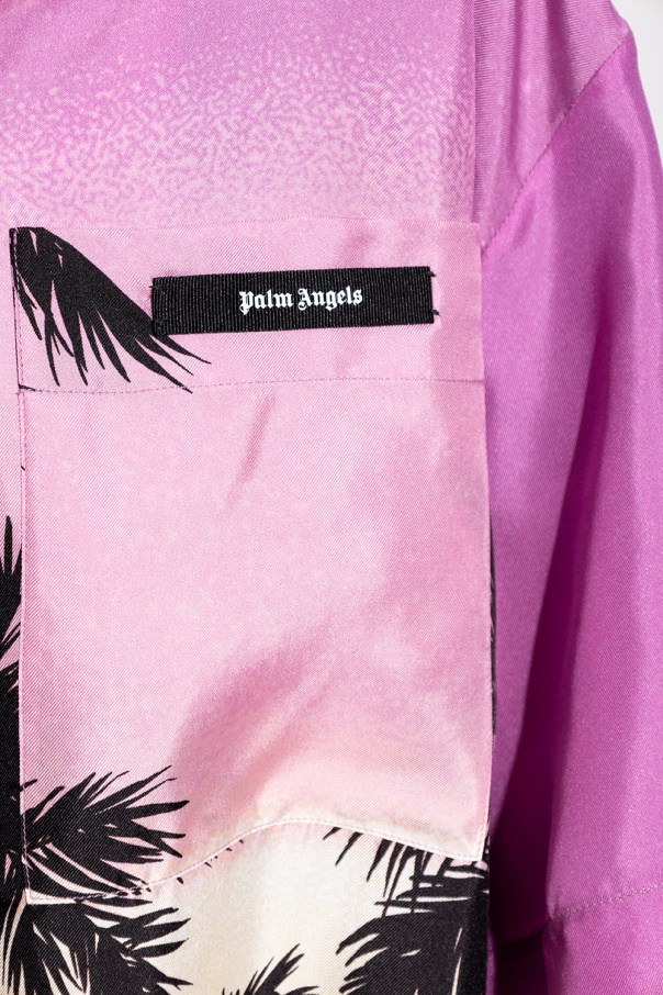 Pink, yellow and black shirt from Palm Angels. Made of silk, this style features a palm tree & logo pattern, button closures, a slip chest pocket and short sleeves.