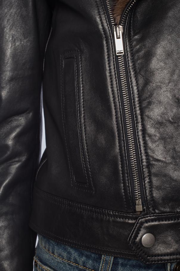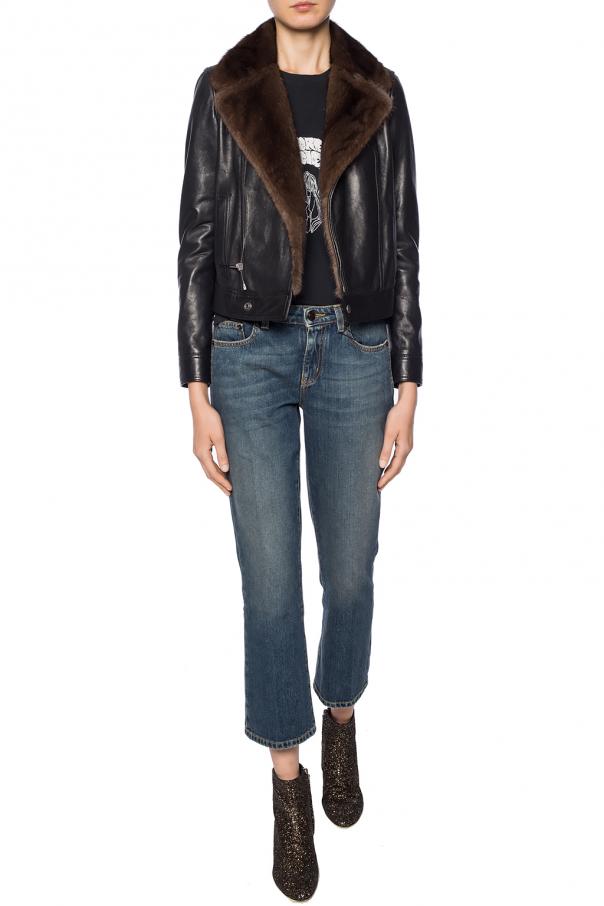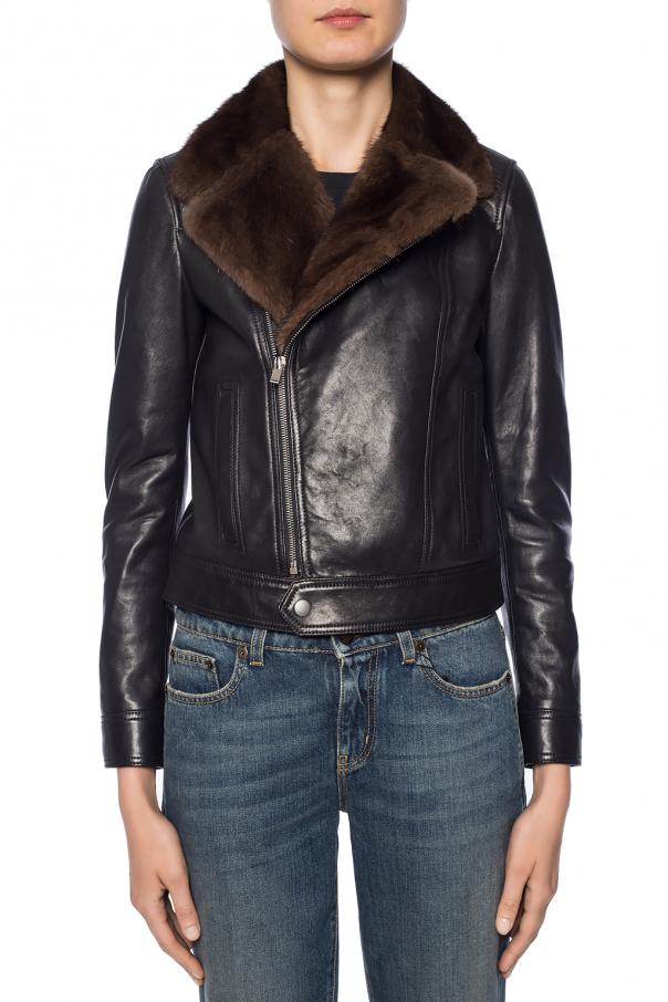 Black jacket from Saint Laurent. Made of lamb leather. Trimmed with brown mink fur. Fastened with zip and snap. 2 slip pockets at front. Long sleeves have zipped cuffs. Silver-tone metal hardware.