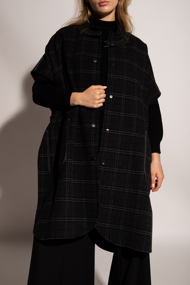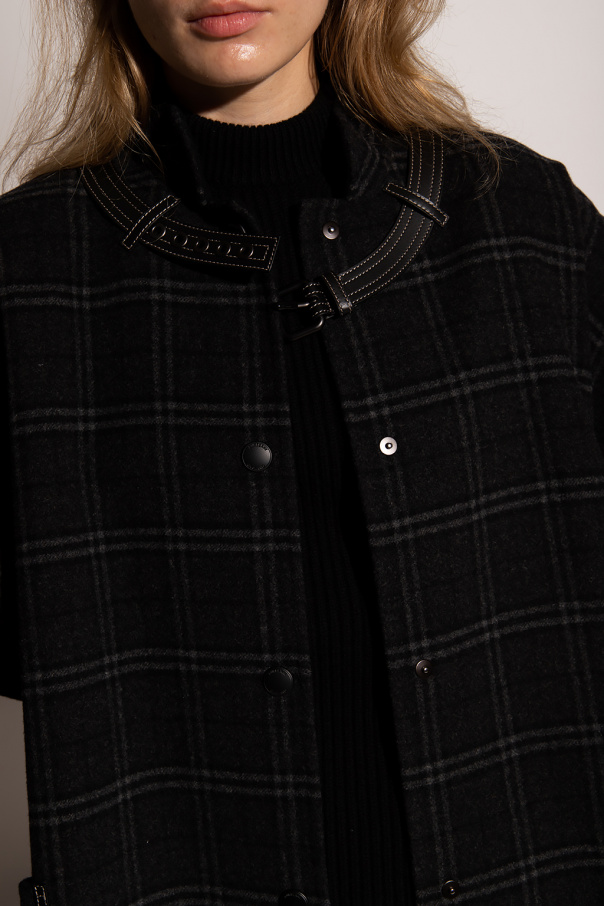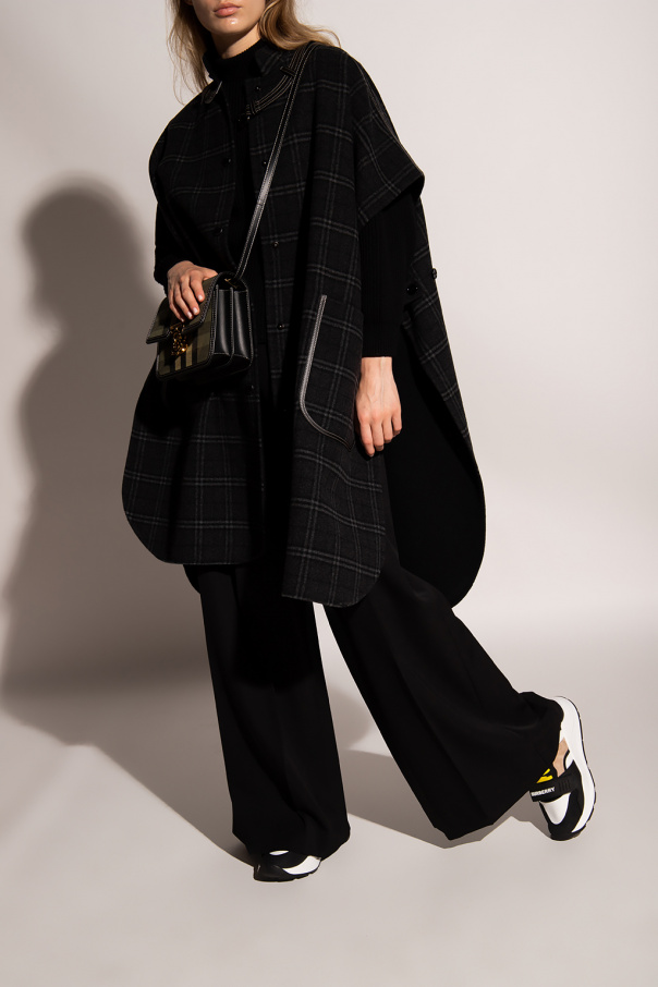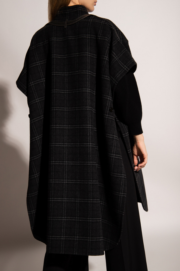 Dark grey poncho from Burberry. Crafted from a wool and cashmere blend with an all-over check pattern, this style features snap fastenings and a buckle strap to the collar.