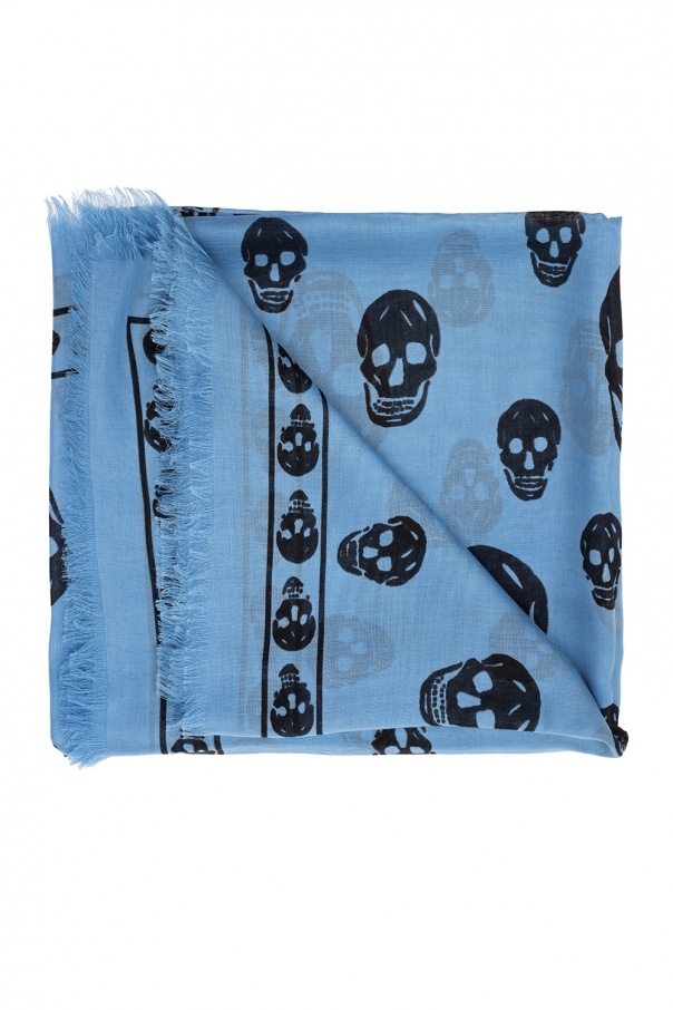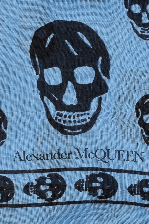 Blue sheer scarf from Alexander McQueen. Made from a silk and modal blend, this item showcases frayed ends and the brand\'s signature skull print with an accompanying logo in navy blue.