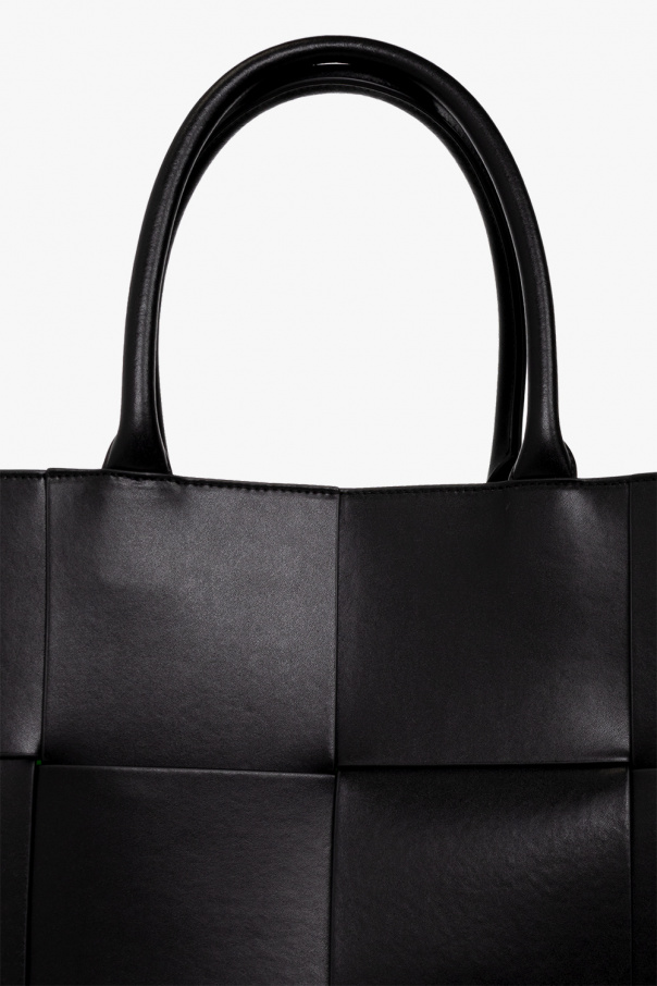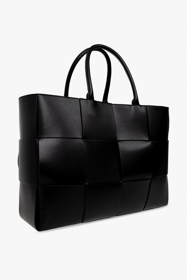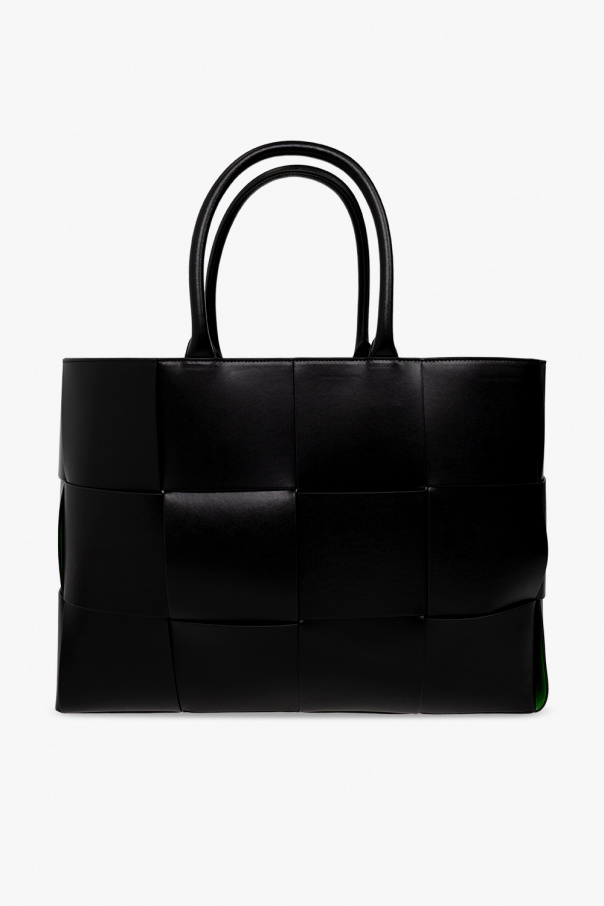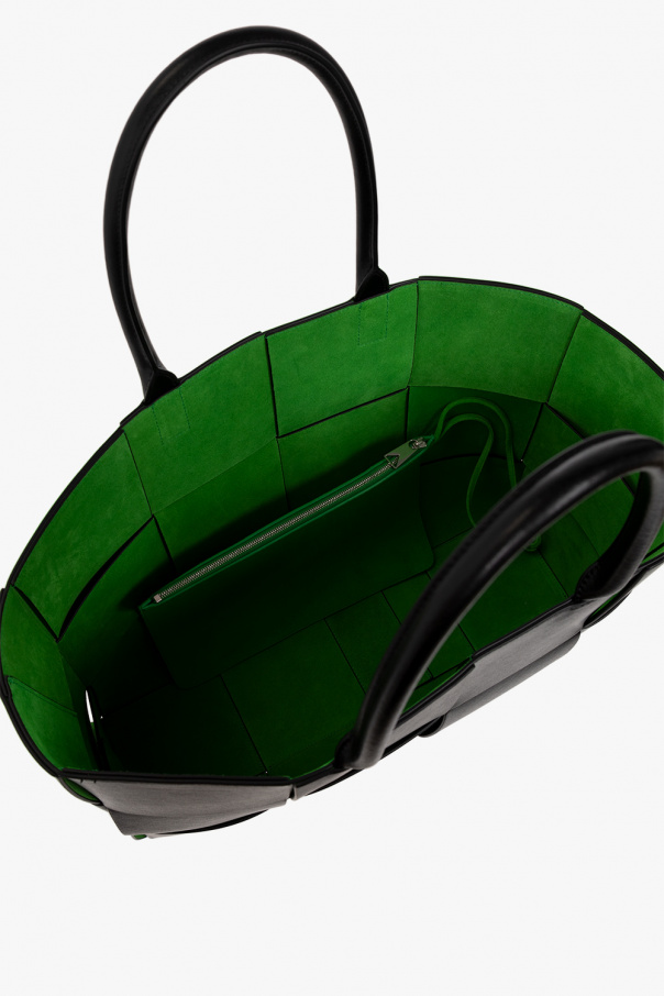 Black ‘Arco Medium’ shopper bag from Bottega Veneta. Made from calf leather with the brand's iconic Intreccio weave, this design features an embossed logo on the side, two half-round handles and a green suede-clad interior with a removable zip pouch.
