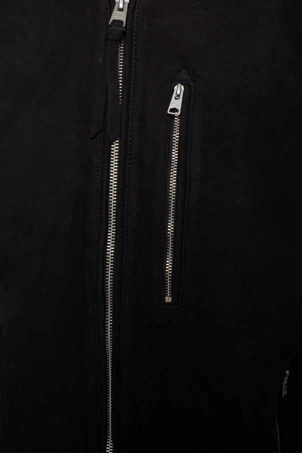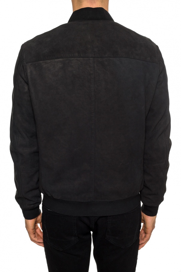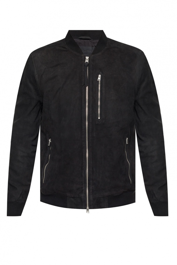 Black ‘Stones’ bomber jacket from AllSaints. Made of suede and textured sheepskin. Fastened with a two-way zip. Three zip pockets on the front. Elasticized hem.