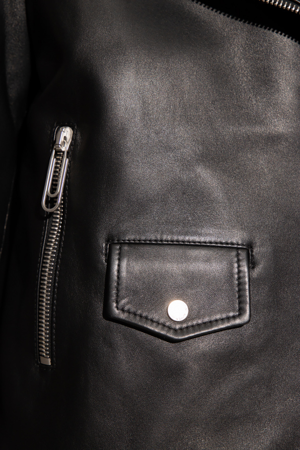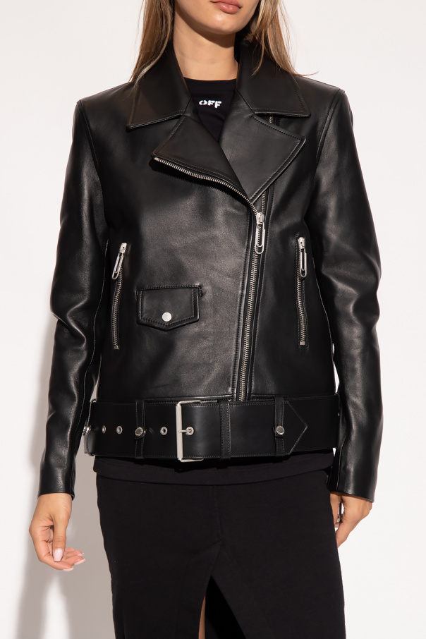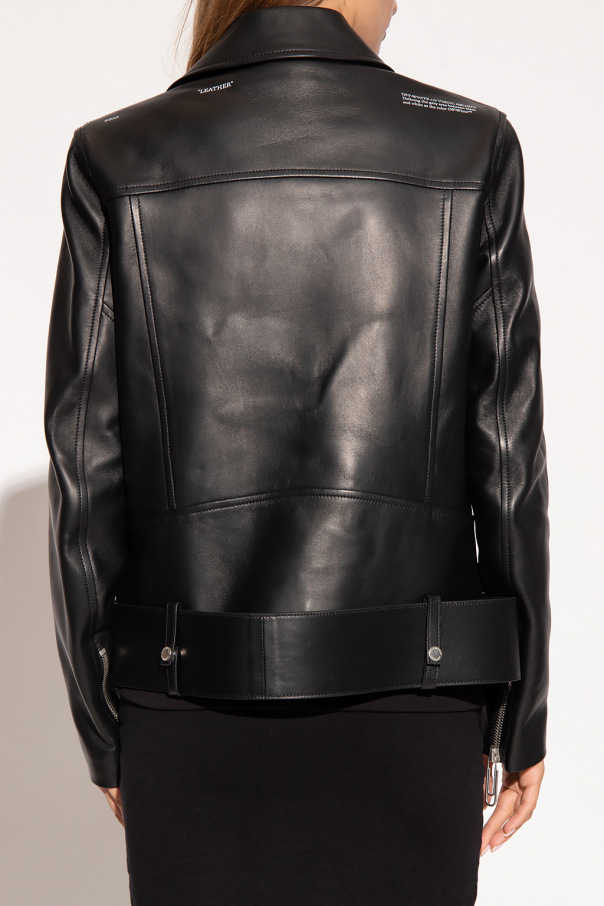 Black oversize biker jacket from Off-White. Made of leather, this garment is complete with a metal zip, buckle strap, two zip pockets, one snap-fastened pocket, white prints at the back, zips with the label’s signature paper clips and silver-tone metal hardware.