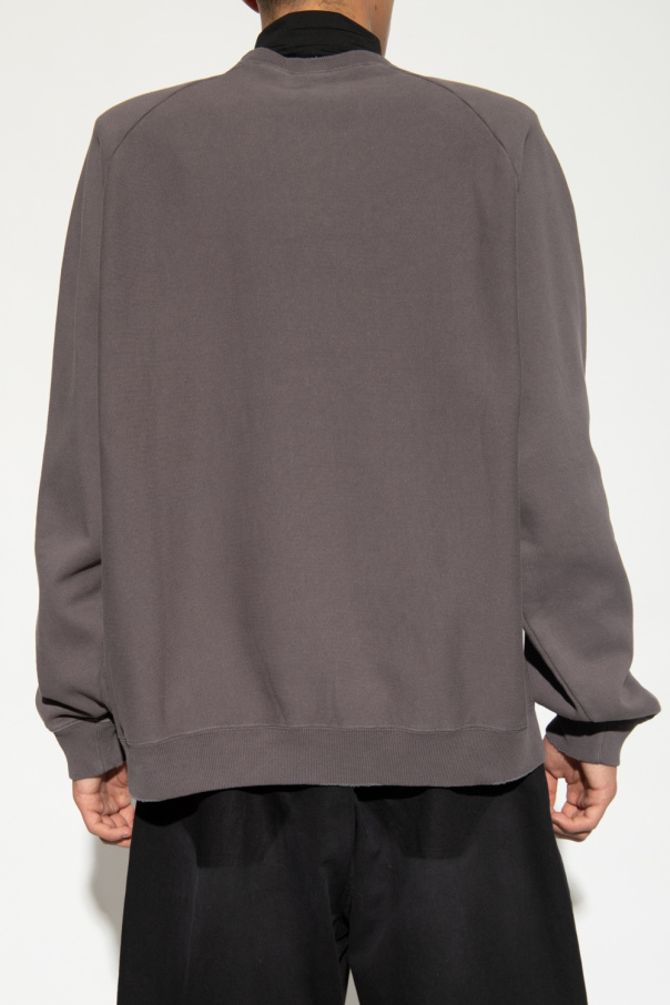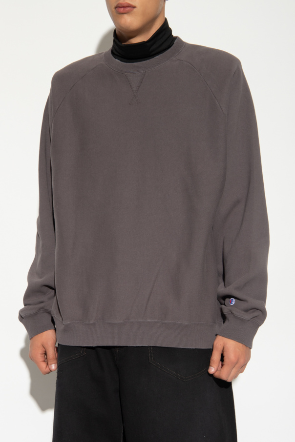 Dark grey crewneck sweatshirt from Champion. Crafted from cotton jersey with a vintage effect, this style features a relaxed fit, long sleeves, a logo patch on the cuff and ribbed trims on the edges.