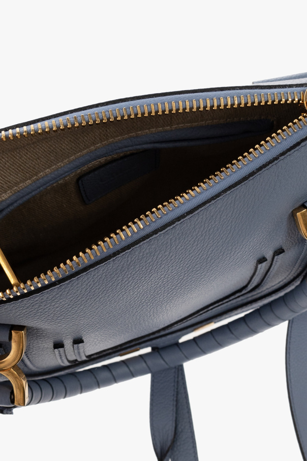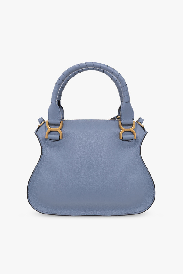 Blue ‘Marcie Double Small’ shoulder bag from Chloé. Crafted from calf leather, this design fastens with a zipper and showcases an embossed logo, exposed stitching details, a frontal pocket with a decorative closure, two half-round handles, a detachable and adjustable shoulder strap, gold-tone metal hardware and one internal compartment with a zip pocket.
