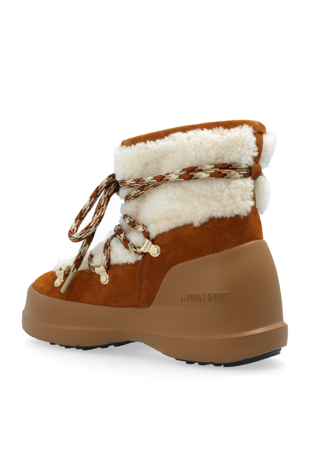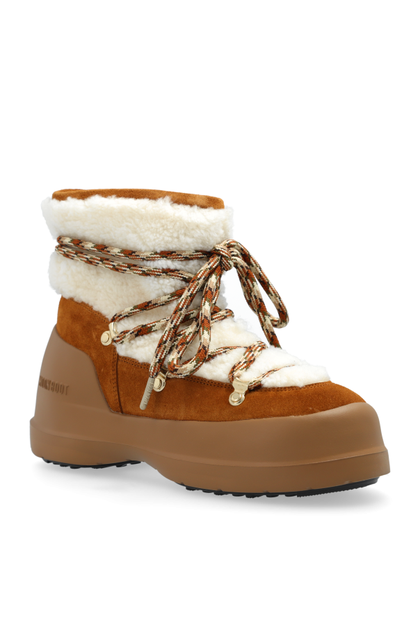 Introducing the Luna Boot Shearling, a masterpiece from the esteemed Moon Boot collection. These exquisite snow boots combine unparalleled elegance with robust functionality, making them an indispensable addition to any winter wardrobe. Crafted from luxurious brown suede, the Luna Boot Shearling envelopes your feet in warmth and style. The inner lining and exterior around the ankle and instep are adorned with soft, white shearling fur, ensuring maximum comfort and insulation against the coldest of elements. Featuring a rounded toe and a thick, flat rubber sole in a complementary brown hue, these boots offer superior stability and grip on slippery surfaces. The sturdy, colorful laces threaded through metal eyelets provide a snug fit, while the embossed designer logo on the outer sole adds a touch of exclusivity. Why Choose the Luna Boot Shearling? High-quality brown suede and white shearling fur for exceptional warmth and comfort. Thick, flat rubber sole for optimal grip and stability on icy surfaces. Stylish and practical design with colorful laces and metal eyelets for a secure fit. Embossed designer logo for a distinctive, exclusive touch.