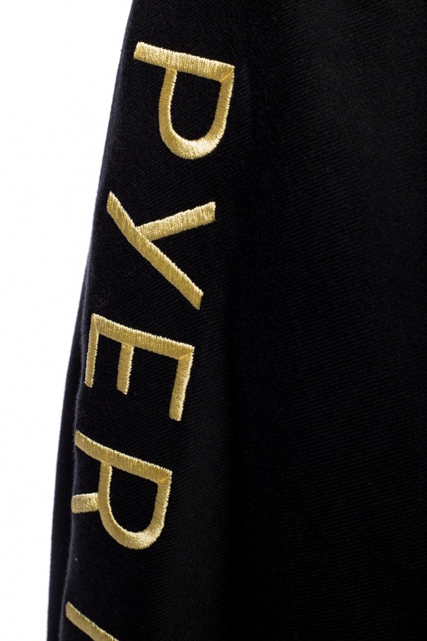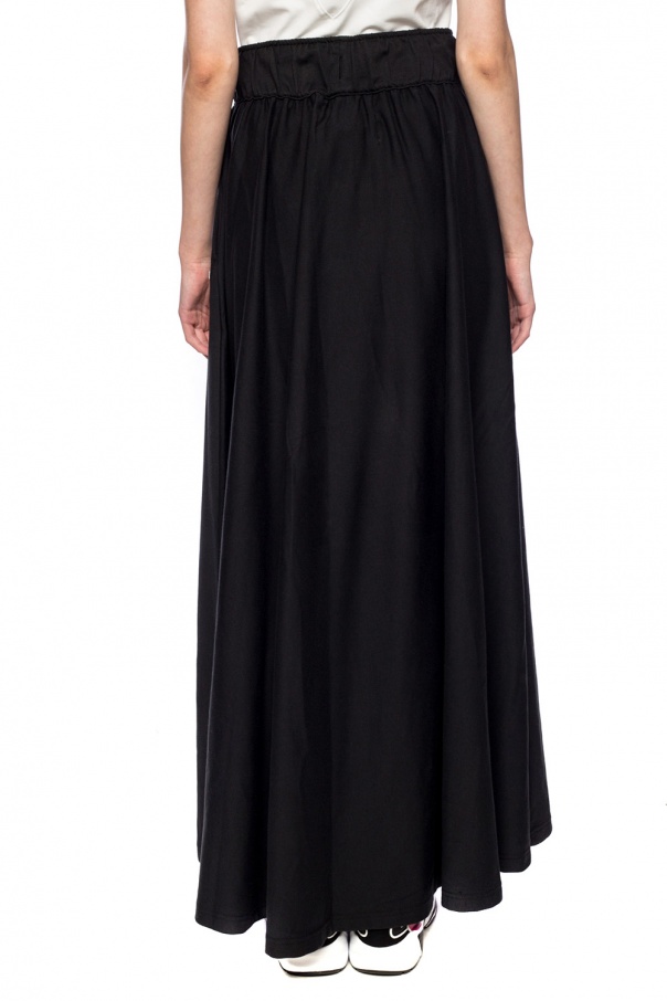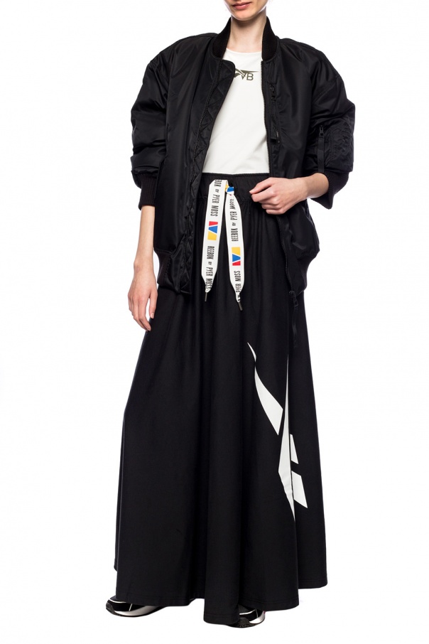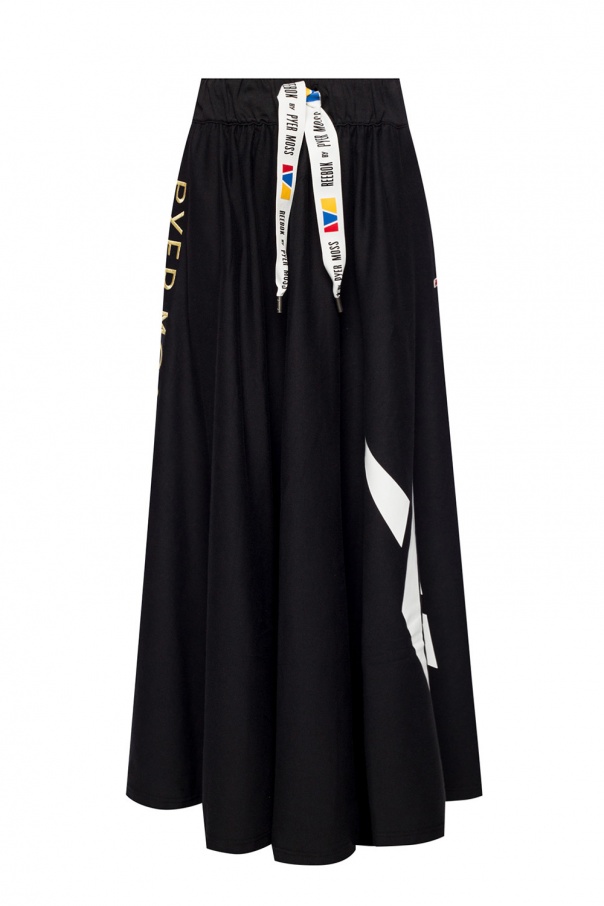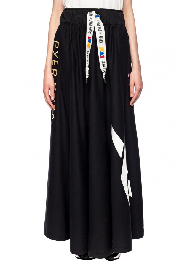 Black flared skirt from Reebok x Pyer Moss. Made of cotton. Elastic waistband tied with colorful, patterned drawstrings. Two slip pockets on the front. Decorated with an embroidered pattern in yellow and a white logo print.