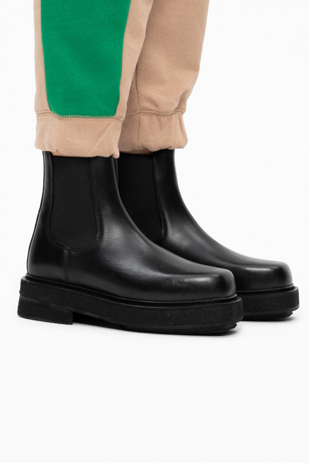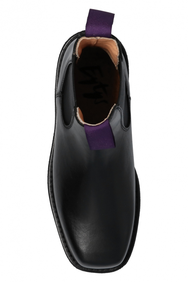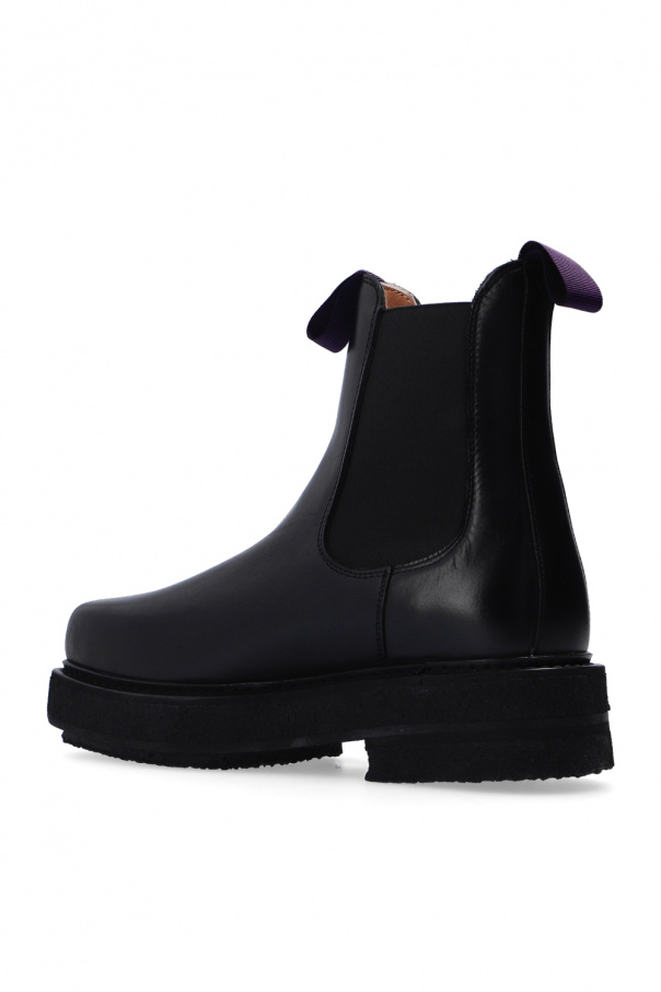 Black ‘Ortega’ platform ankle boots from Eytys. Made of leather. Sides trimmed with elastic inserts. Purple grosgrain strap sewn-in on the front and at the back. Black rubber sole.