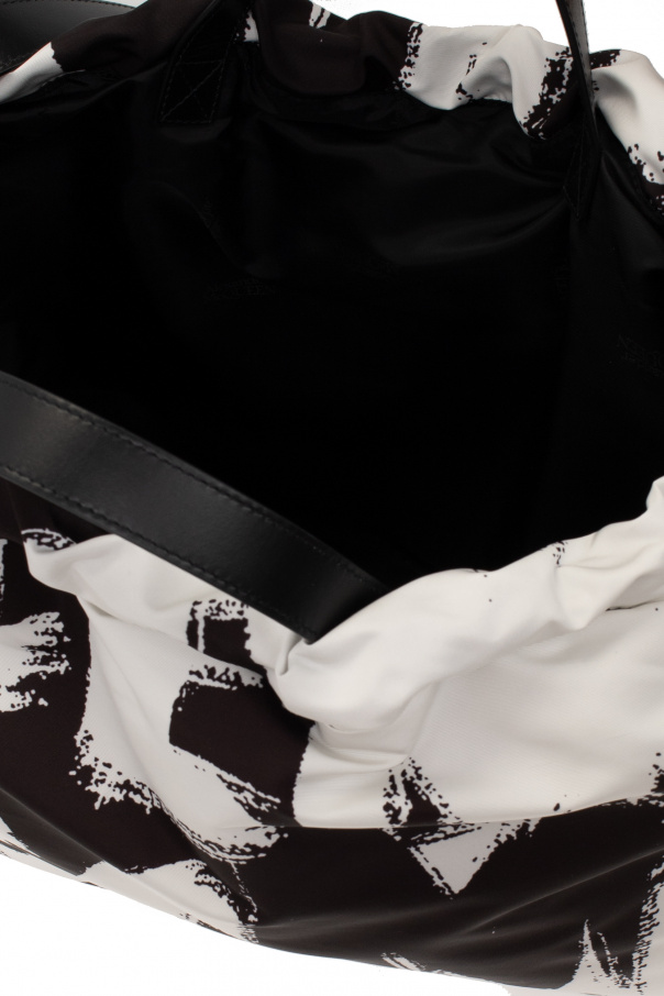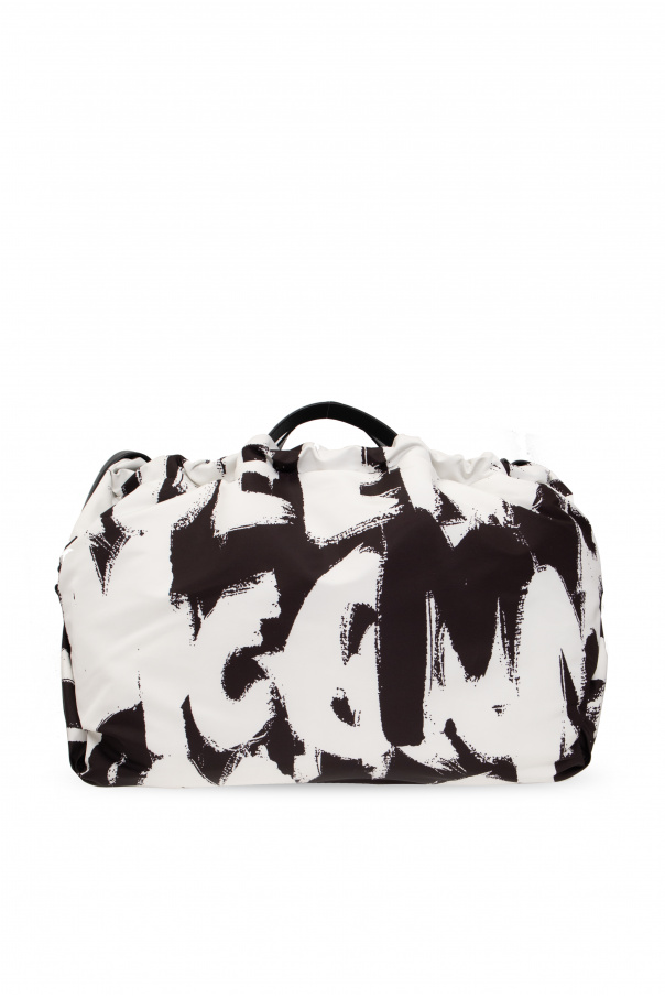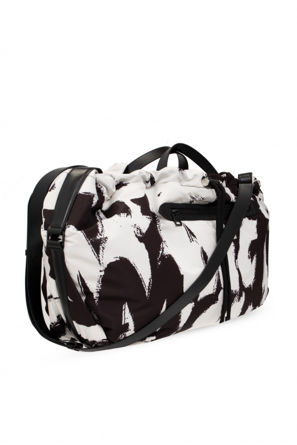Black and white holdall bag from Alexander McQueen. Crafted from recycled materials, this model features drawstrings, a logo detail, front zip pocket, two half-round handles, adjustable shoulder strap and one internal compartment with two slip pockets.