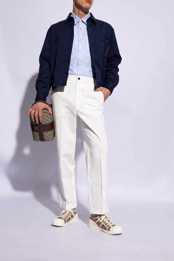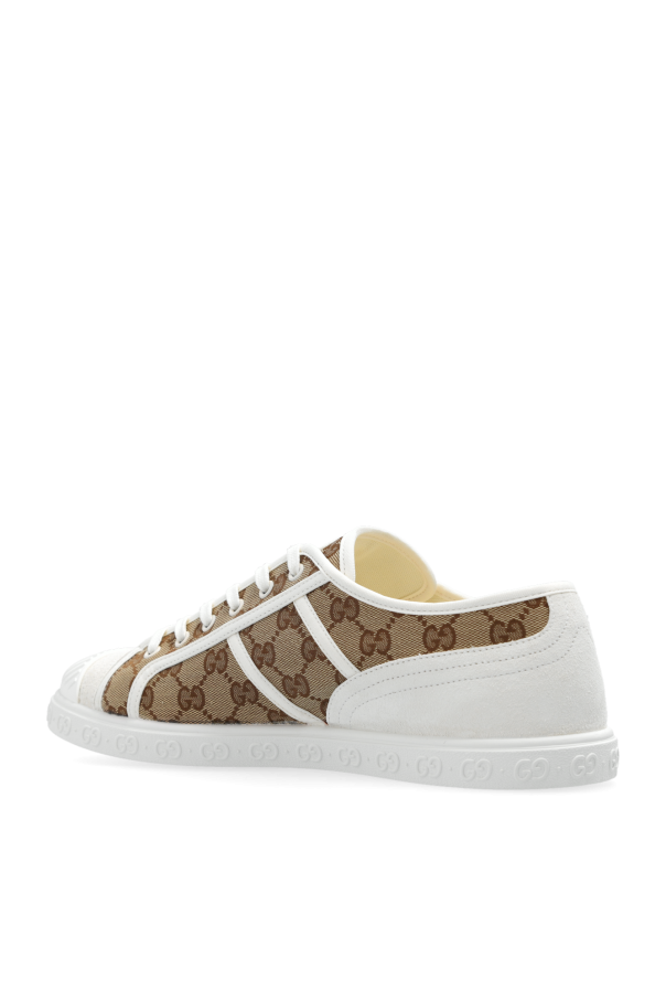 Beige, brown and cream sneakers from Gucci. Made from canvas and suede, this lace-up model sits on a white rubber sole and showcases a monogram pattern and the brand\'s logo.