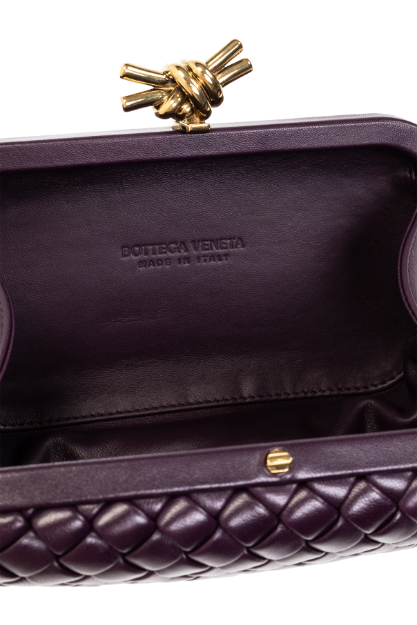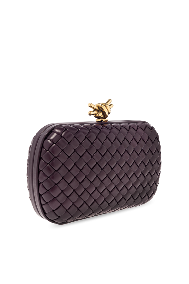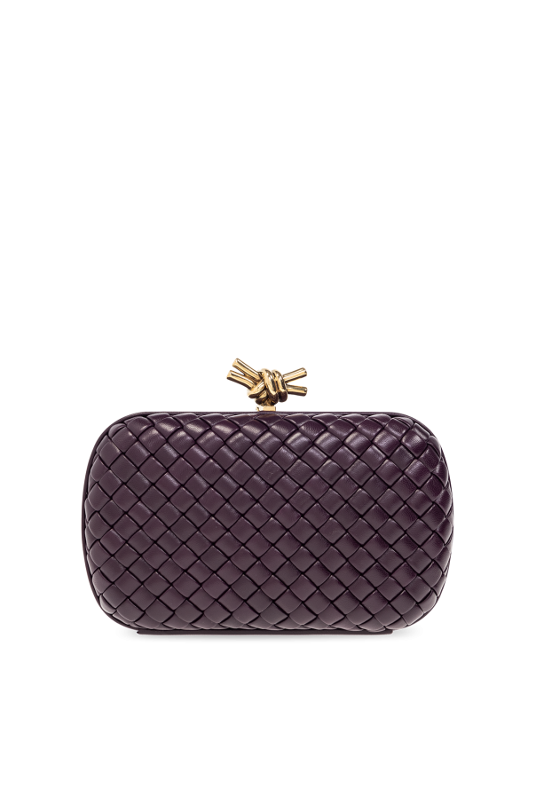 Dark purple ‘Knott Small’ clutch from Bottega Veneta. Made of lamb leather, this model features a snap button with a knot detail, the brand’s signature Intreccio weave, one internal compartment and antique gold-tone metal hardware.