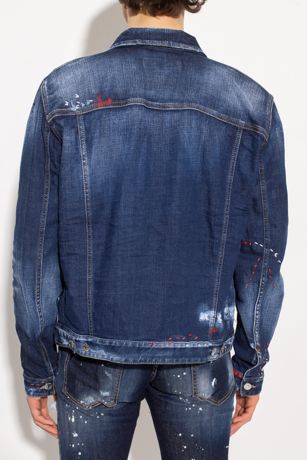 Blue ‘Dan’ denim jacket from Dsquared2. Embellished with multiple colourful stitching details, red paint splatter effects and stonewashed treatment, this style features button fastenings, two welt pockets, two flapped button pockets and long sleeves with button cuffs.