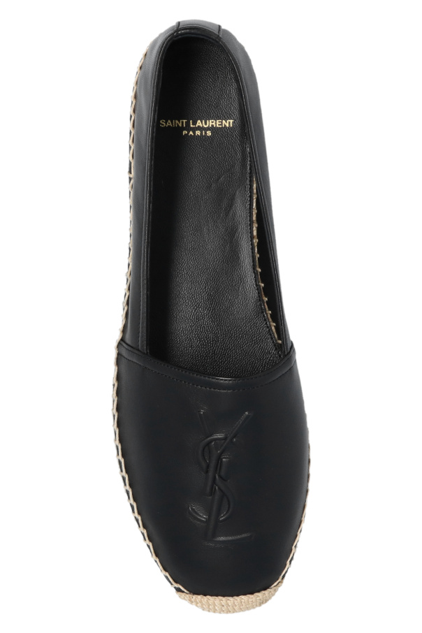 Black espadrilles from Saint Laurent. Crafted from lamb leather, this model features a raised logo and beige rubber sole trimmed with jute.
