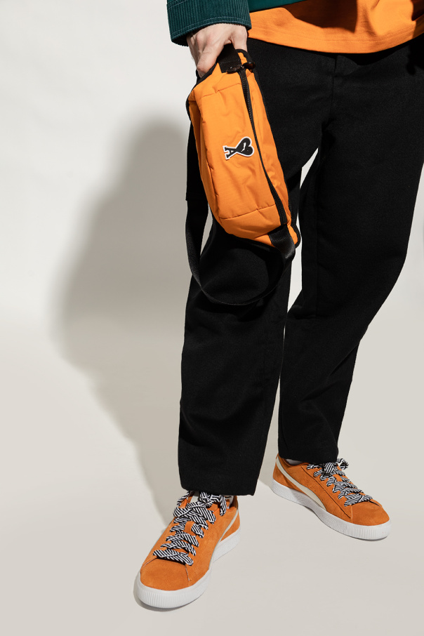 Orange belt bag from PUMA x AMI. Boasting a white and black patch which is a hybrid of the brands' ‘PUMA Cat’ and ‘Ami de Cur’ logo motifs, this design features a two-way zip fastening, an adjustable strap with a buckle closure, and one internal compartment with a zip pocket.