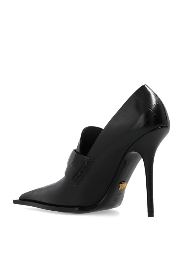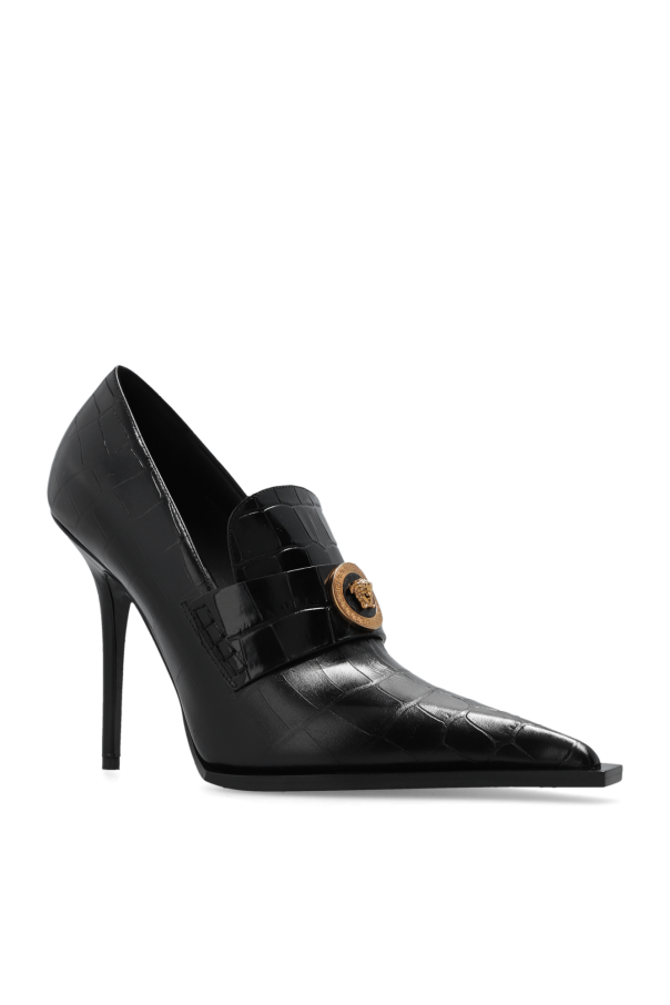 Black pumps from Versace. Made from leather with a crocodile skin effect, this model sits on a black leather sole and features a pointed toe silhouette and round gold-tone hardware with the brand\'s signature Greca and Medusa face motifs on the front.