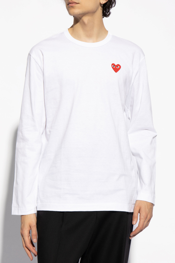 White T-shirt from Comme Des Garçons Play. Made of cotton. Front decorated with a logo patch in red, white and black. Round neck. Long sleeves.