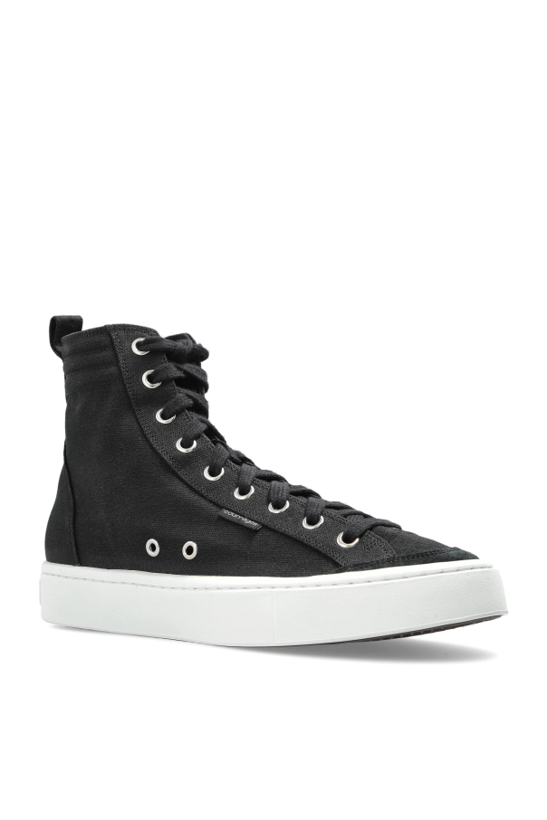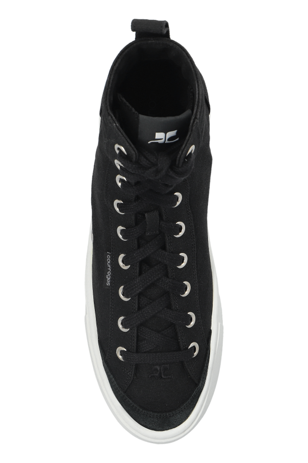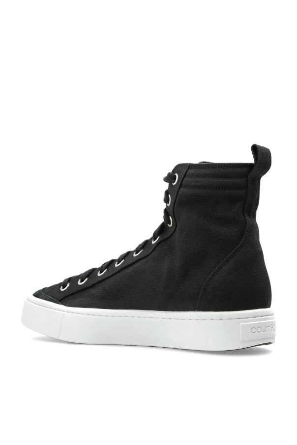 Introducing the Courreges X Vestiaire sneakers, a quintessential embodiment of sophistication and avant-garde aesthetics. These black sneakers, from the exclusive Courrèges collection, seamlessly blend modern elegance with casual allure. The high-profile design, with an ankle-reaching upper, exudes contemporary chic. Crafted from premium textile or leather, the sneakers feature distinctive seams along the sides, adding a touch of finesse. The metal eyelets and dual side ventilation eyelets enhance comfort, while subtle branding on the tongue and side speaks to its exclusive lineage. The stark contrast of the white rubber sole against the black upper, with the signature \"COURREGES\" emblazoned on the heel, embodies the brand\'s innovative spirit. Courrèges, under the visionary direction of Nicolas Di Felice, continues its legacy of futuristic silhouettes and technical materials, making these sneakers a versatile addition to any wardrobe. Why Choose This Product? Exquisite Design: Blends classic elegance with modern details. Premium Materials: High-quality textile or leather craftsmanship. Unique Elements: Metal and ventilation eyelets for style and comfort. Iconic Branding: Features Courrèges\' signature on the sole. Versatile Style: Perfect for both casual and sophisticated ensembles.