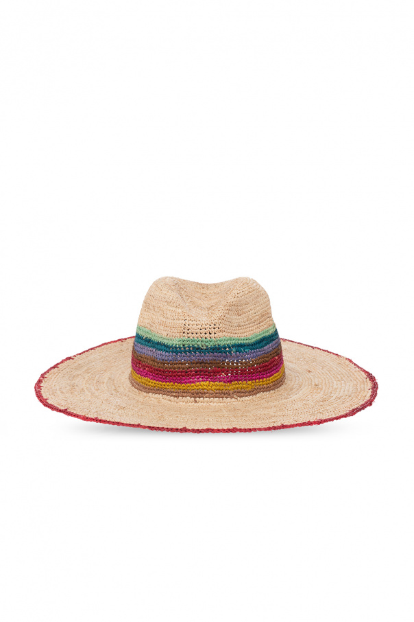Beige from Etro. Made of woven raffia with a wide brim, this item features colourful stripes and red stitch trimming.