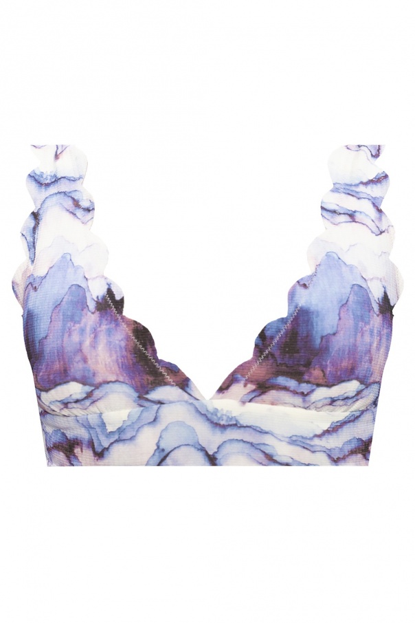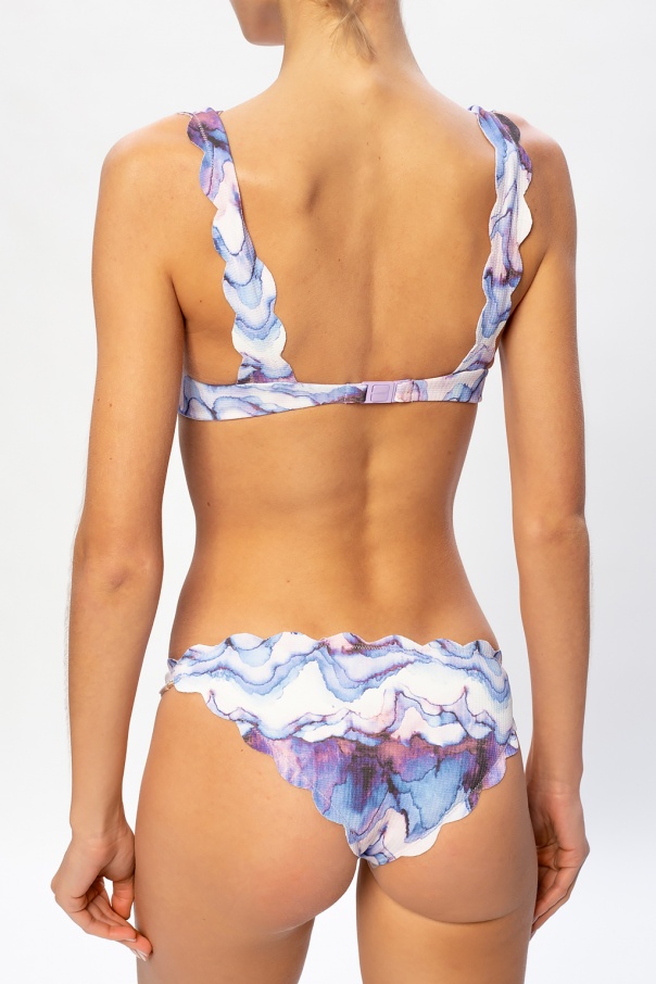 Blue, white and purple swimsuit top from Marysia. Crafted in ribbed knit fabric with a tie-dye effect, this item fastens via a snap and is scalloped with a raw, hand-cut edge.