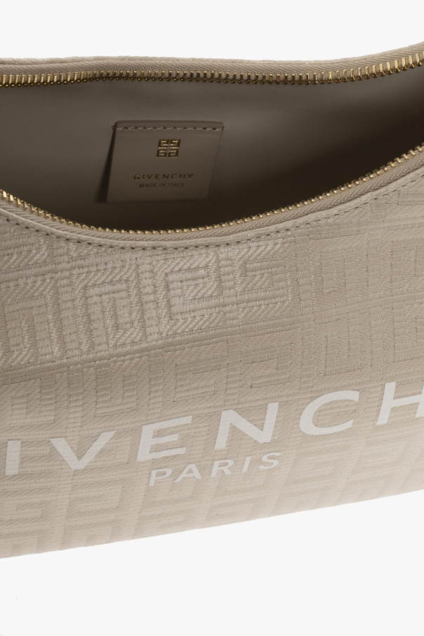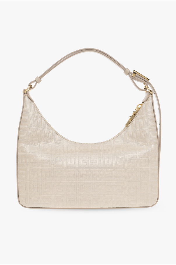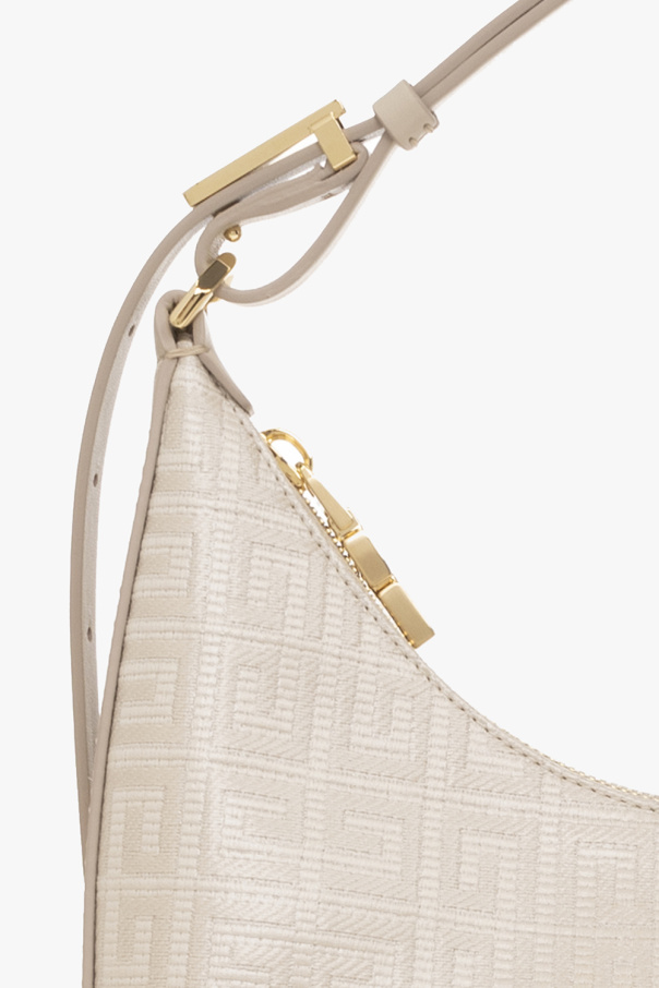 Beige and cream ‘Moon Cut Out Small’ handbag from Givenchy. Made of faux leather, this model is complete with a zip, embossed 4G monogram, white logo print, adjustable handle, one internal compartment with black lining and gold-tone metal hardware.