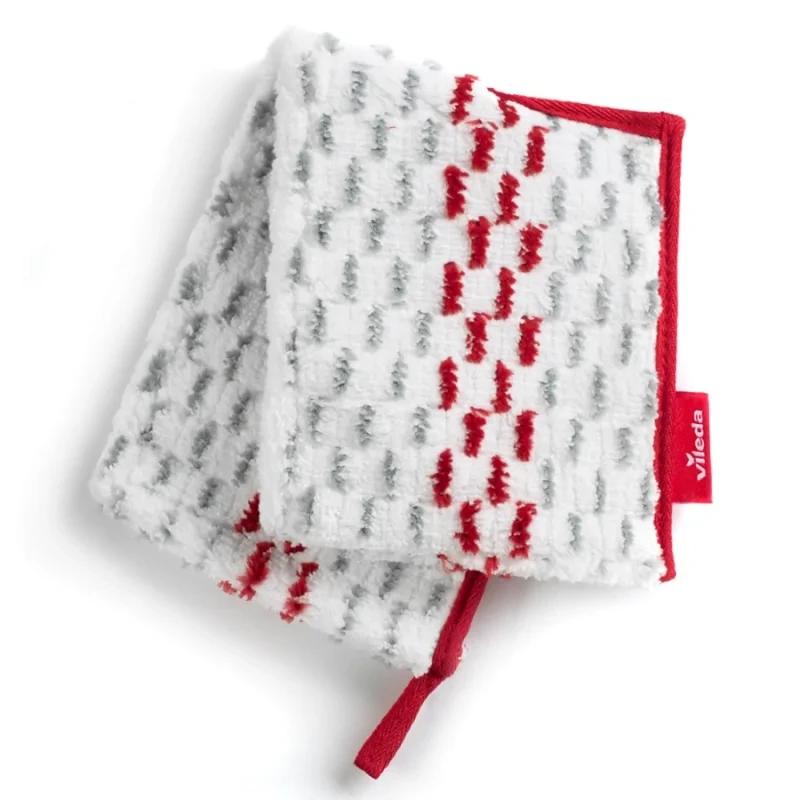 - ## Сменные насадки для швабры 1-2 Spray Max Vileda с красными волокнами идеально очищают даже стойкие загрязнения.
