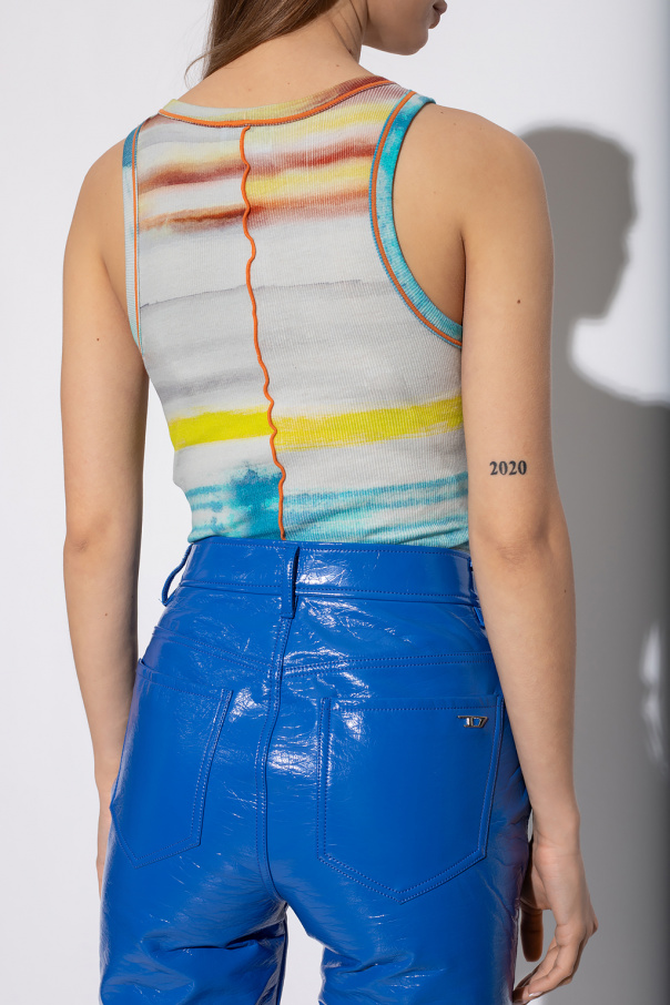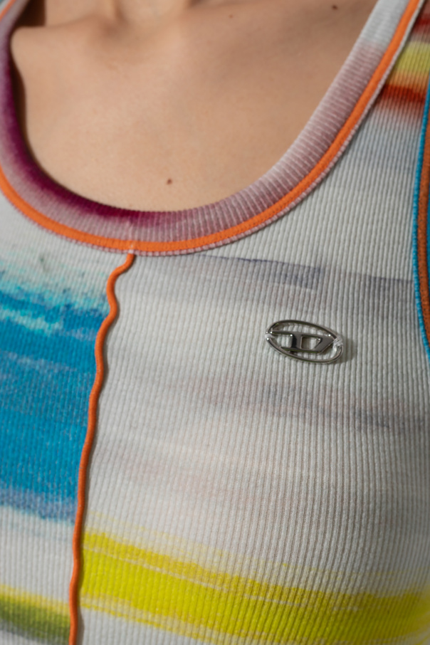 Multicoloured 'T-Ankycut' tank top from Diesel. Made of a ribbed cotton blend, this style features a stripe pattern, distinctive curled overlock seams and a silver-tone logo appliqué on the front.