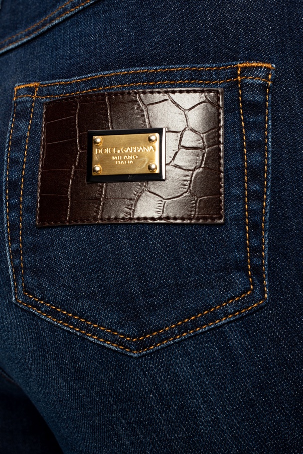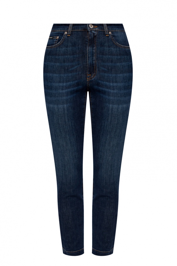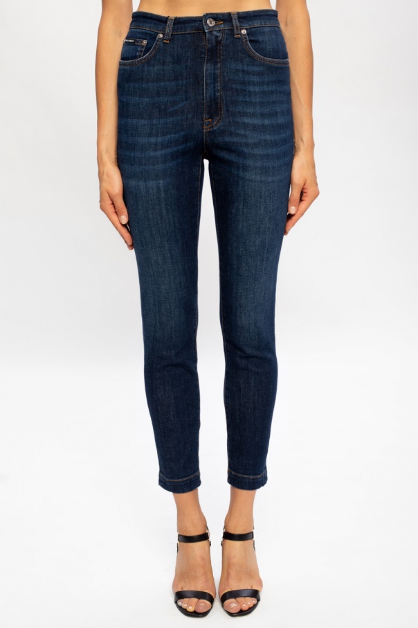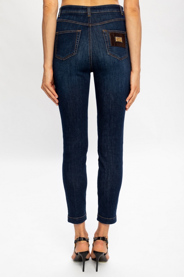 Navy jeans from Dolce & Gabbana. Fastened with a zip and button, this high waist design with tapered legs is complete with three front pockets and two back pockets, one decorated with a logo appliqué.