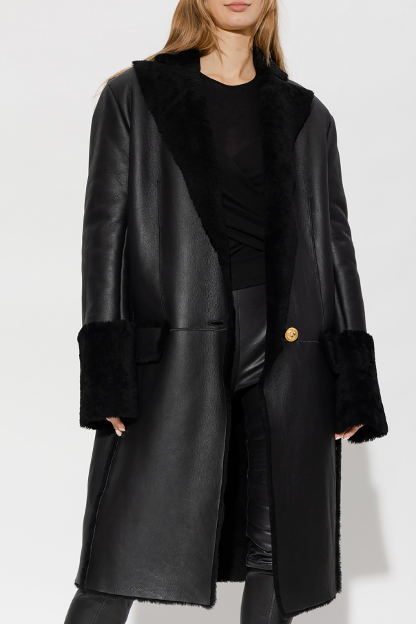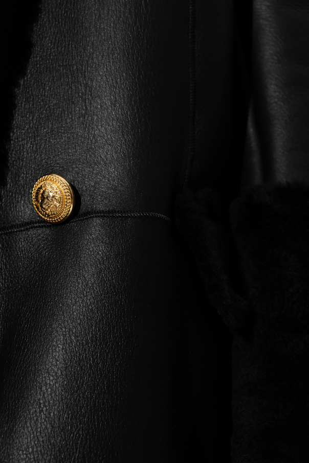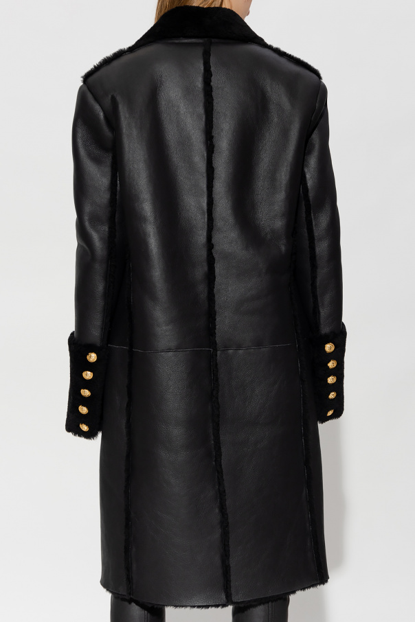 Black shearling coat from Balmain. Crafted from lamb leather with an oversize fit, this style features a decorative button with the brand\'s signature lion head in gold-tone, a collar with peak lapels and cuffs trimmed with shearling, two flapped pockets and long sleeves,