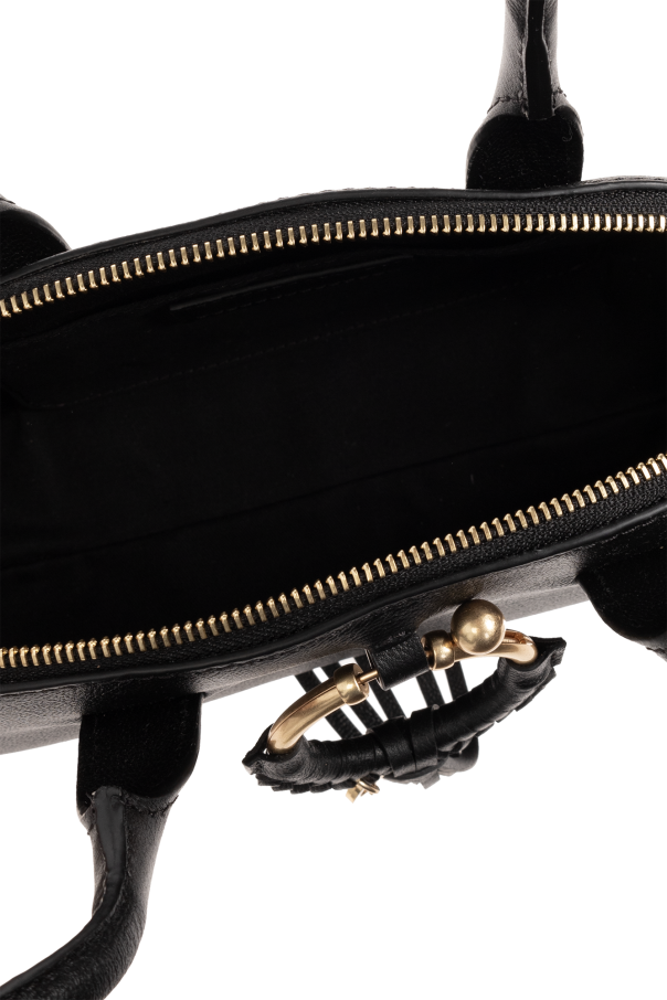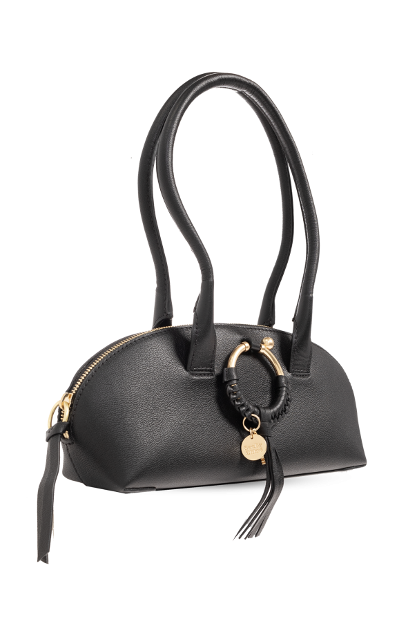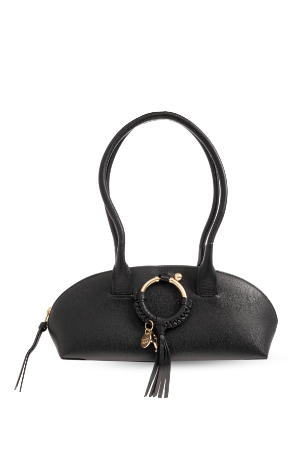 Black ‘Joan’ shoulder bag from See By Chloe. Crafted from leather, this model features a zip fastening, round charm with decorative details and fringes, two handles, gold-tone metal hardware and one internal compartment with one slip pocket.