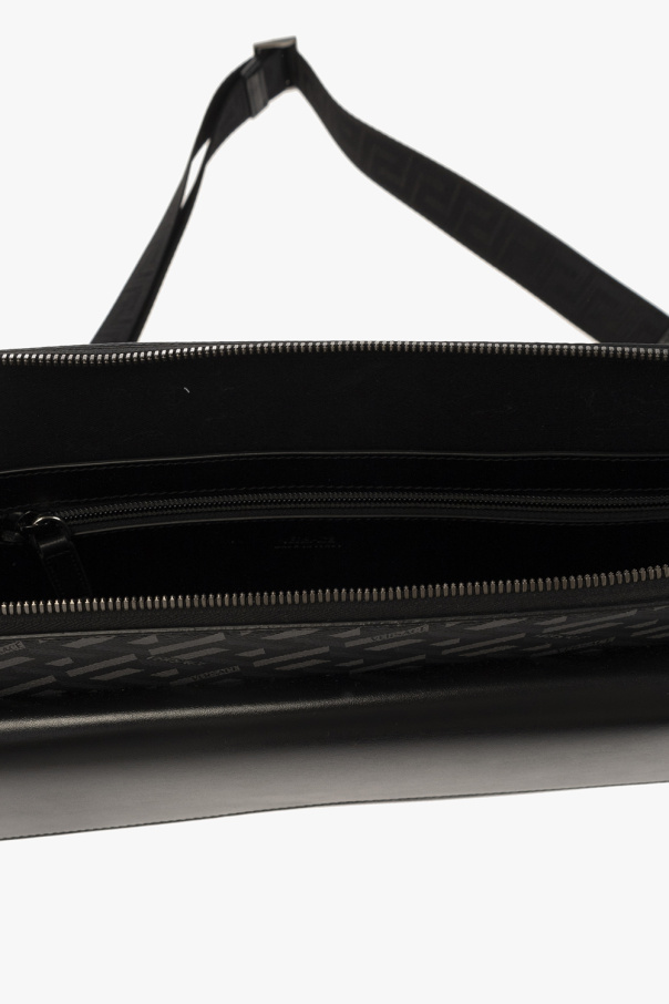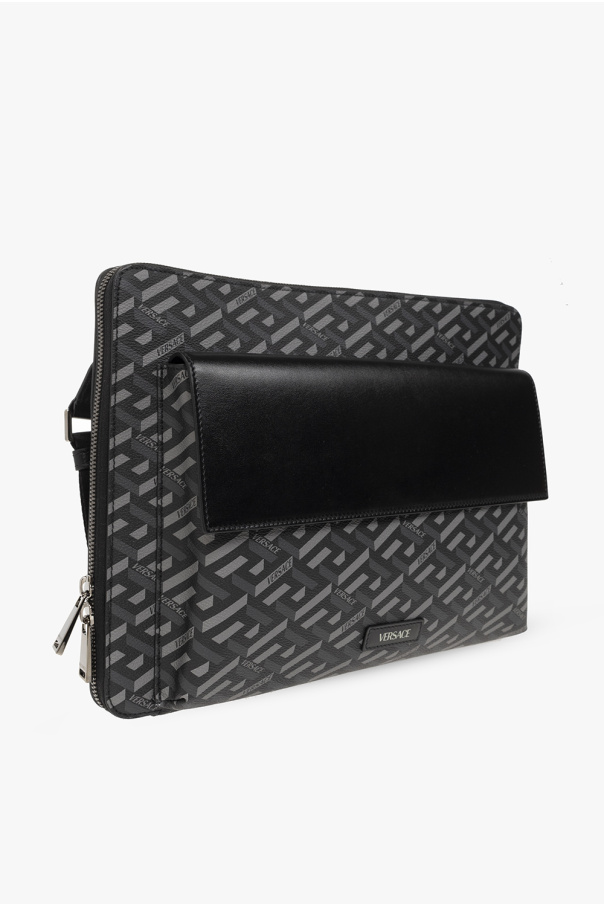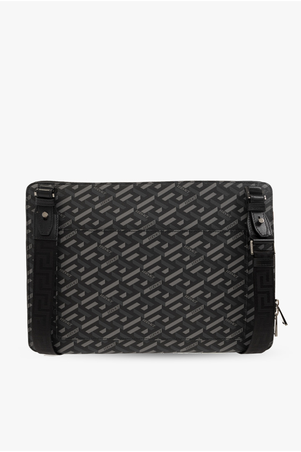 Black and grey shoulder bag from Versace. Made of coated canvas with the La Greca pattern and leather trimming, this model fastens with a two-way zip and is complete with a snap-fastened front pocket, back pocket, detachable and adjustable shoulder strap with a Greek pattern, silver-tone metal hardware and one internal compartment with a slip pocket, zip pocket and pen holder.
