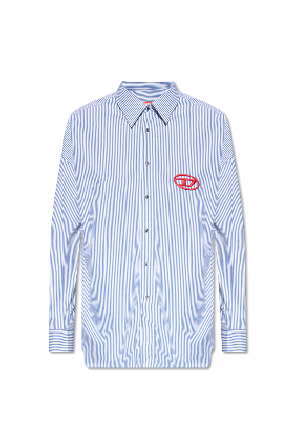 White and blue ‘S-DOUBER’ shirt from Diesel. Made of cotton, this garment features button fastenings, a red logo embroidery, stripe pattern and long sleeves with buttoned cuffs.