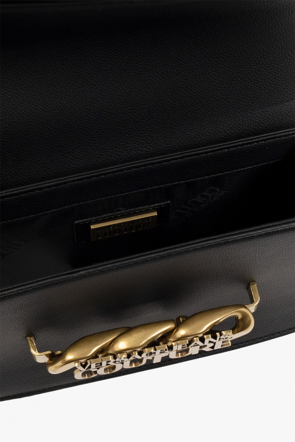 Black shoulder bag from Versace Jeans Couture. Crafted from faux leather, this design features a flap fastening with chain & logo detailing on the front, a detachable and adjustable shoulder strap, antiqued gold-tone metal hardware and one internal compartment with a slip pocket.