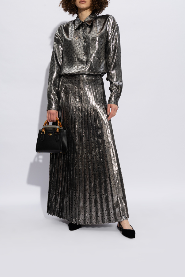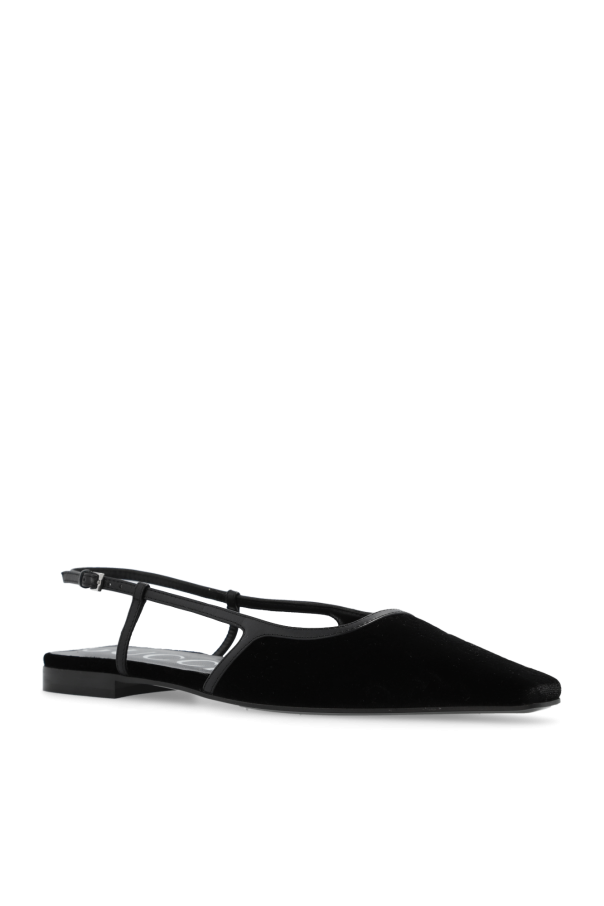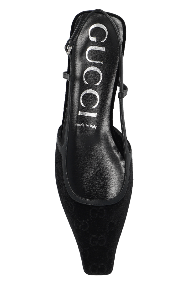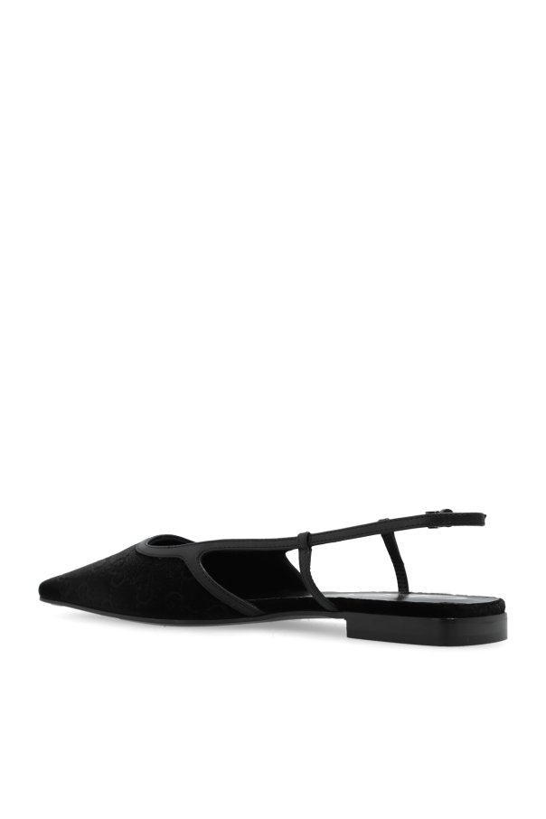 Black ballet flats from Gucci. Made from velvet, this model sits on a black leather sole and showcases a monogram pattern, an adjustable slingback strap with a buckle and an elongated square toe.