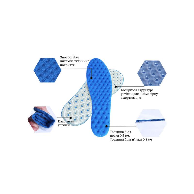 ✔️ Материалы: TPU (высокотемпературный полиуретан), инертный газ, износостойкое «дышащее» тканевое покрытие синего цвета.📏 Толщина стелек: 📏
