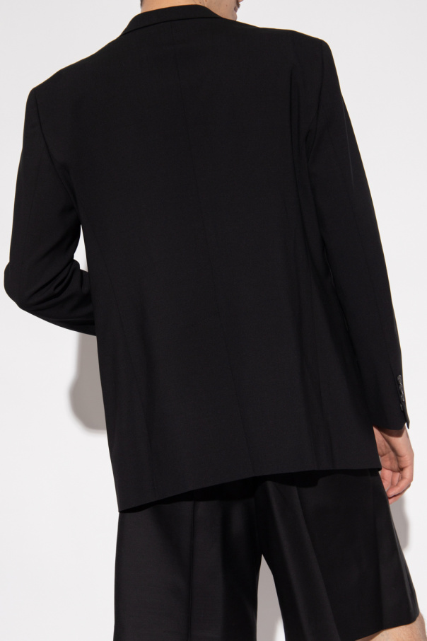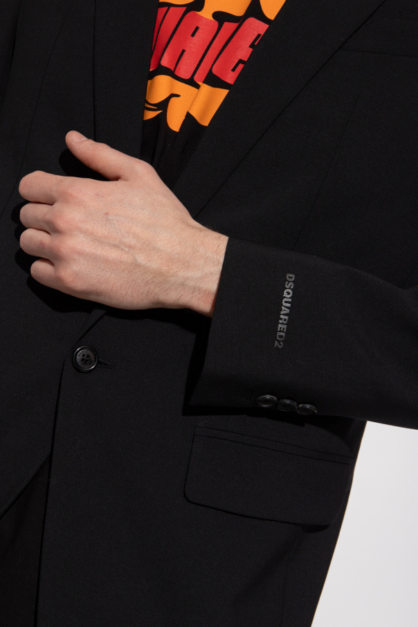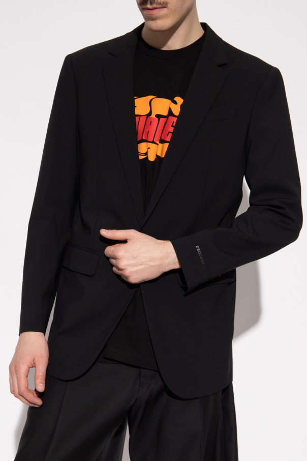 Black ‘Berlin’ blazer from Dsquared2. Crafted from a stretch wool blend with a fitted silhouette, this style features a single button closure, notch lapels, two flapped pockets, one slip pocket, a single back vent and long sleeves with button cuffs and a logo application.