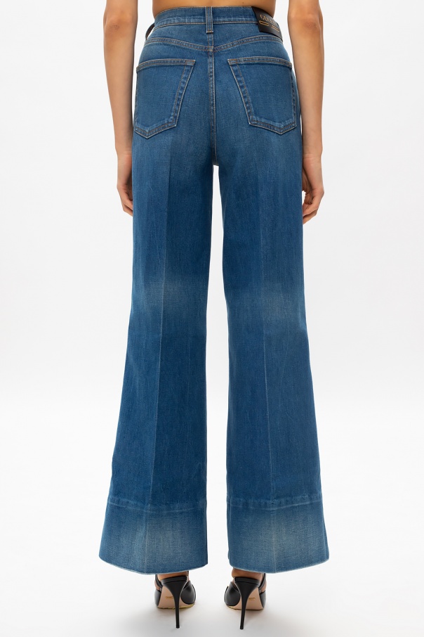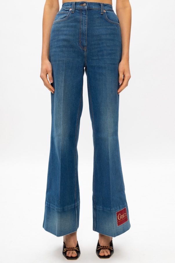 Blue jeans from Gucci. Falling down with ample, flared legs, this pair fastens via button and is complete with five pockets. For the brand identification, jeans are emblazoned with two logo patches in gold-tone, red, yellow and black.