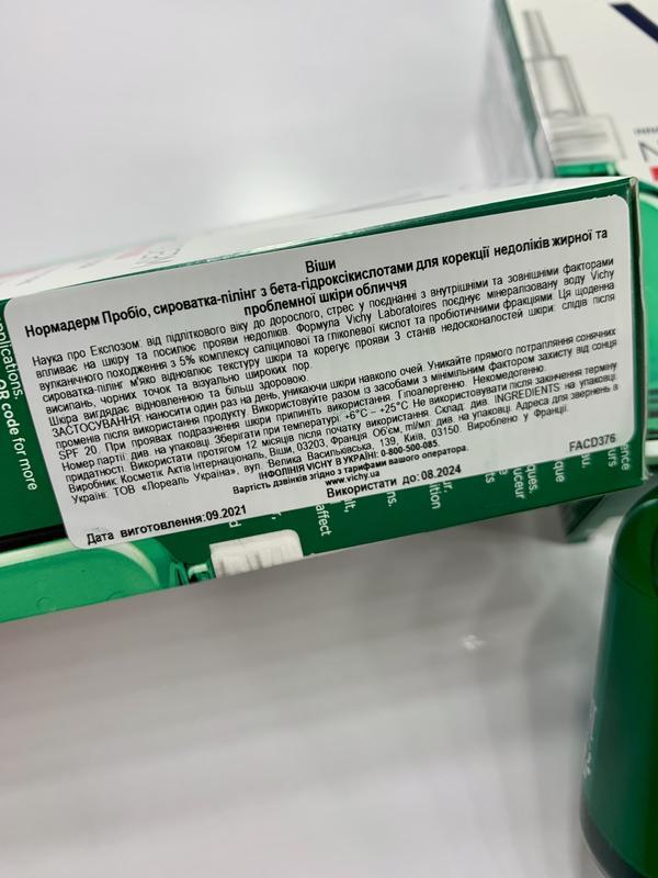 Ціна — 860 гривень.Щоб не зашкодити проблемній шкірі, для догляду за нею треба вибирати косметичні продукти з клінічно підтвердженою ефективністю. Чудовий приклад такого засобу — сироватка-пілінг Normaderm від Vichy. Вона містить комплекс 5% саліцилової та гліколевої кислот, спеціально розроблений для корекції вад жирної та проблемної шкіри, починаючи з їх перших проявів і завершуючи рубцями постакне. Саліцилова кислота забезпечує відлущування, а гліколева стимулює оновлення шкірного покриву, робить його м'якшим, вирівнює тон і мікрорельєф.