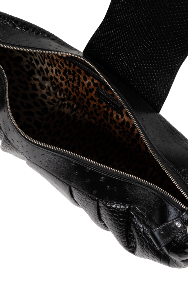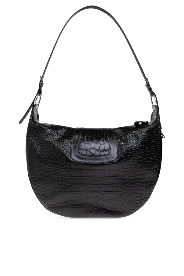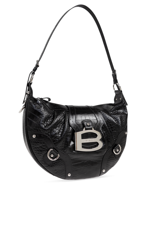 Introducing the Essex Shoulder Bag from the illustrious house of Balenciaga, a paragon of opulence and modernity. This exquisite piece, crafted by visionary designer Demna Gvasalia, marries the brand\'s storied heritage with contemporary sophistication. Fashioned from premium black calfskin leather with an intricate crocodile-like texture, the Essex Shoulder Bag exudes an air of refined luxury. The interior, lined with a captivating leopard-print fabric, offers a delightful contrast, infusing the bag with a unique flair. The semi-circular silhouette of this larger shoulder bag ensures it is both stylish and practical for everyday use. Adorned with a prominent silver-toned metal \"B\" logo on the front, it is unmistakably Balenciaga. Complementary silver hardware, including rings and rivets, further accentuates its bold character. The adjustable shoulder strap, crafted from the same sumptuous material, ensures a cohesive design while providing comfort and versatility. Secured with a zipper and a magnetic snap, the Essex offers ample space and a zippered pocket within, ensuring your essentials are both safe and organized. Why Choose This Product? Exquisite crocodile-like textured black calfskin leather Unique leopard-print fabric interior Iconic silver-toned metal \"B\" logo Adjustable and matching shoulder strap Secure zipper and magnetic snap closure Spacious interior with additional zippered pocket Designed by the renowned house of Balenciaga