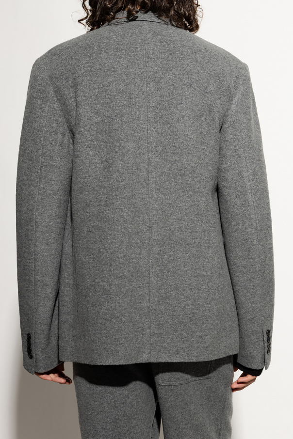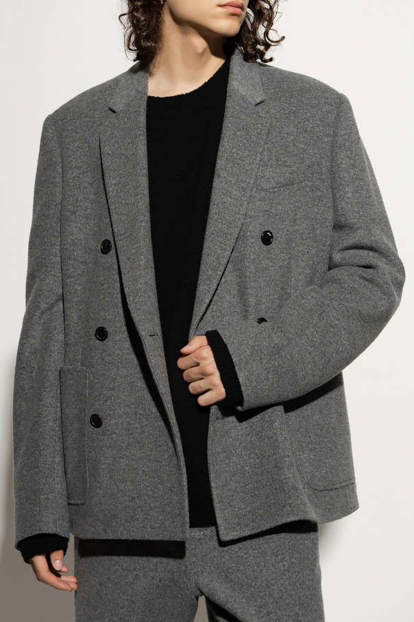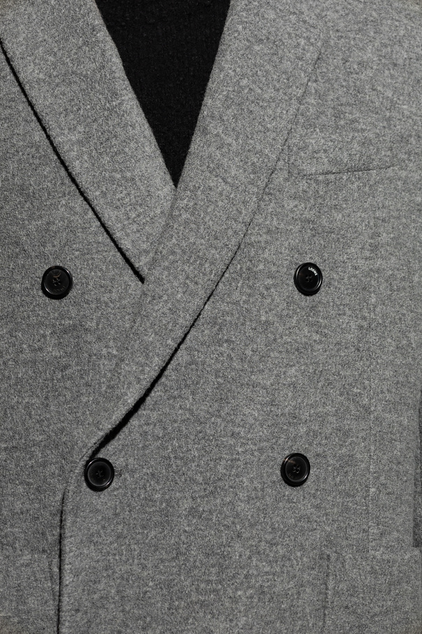 Short, grey, double-breasted coat from Loewe. Made of wool, this long sleeve design features button fastenings notch lapels and three slip pockets.