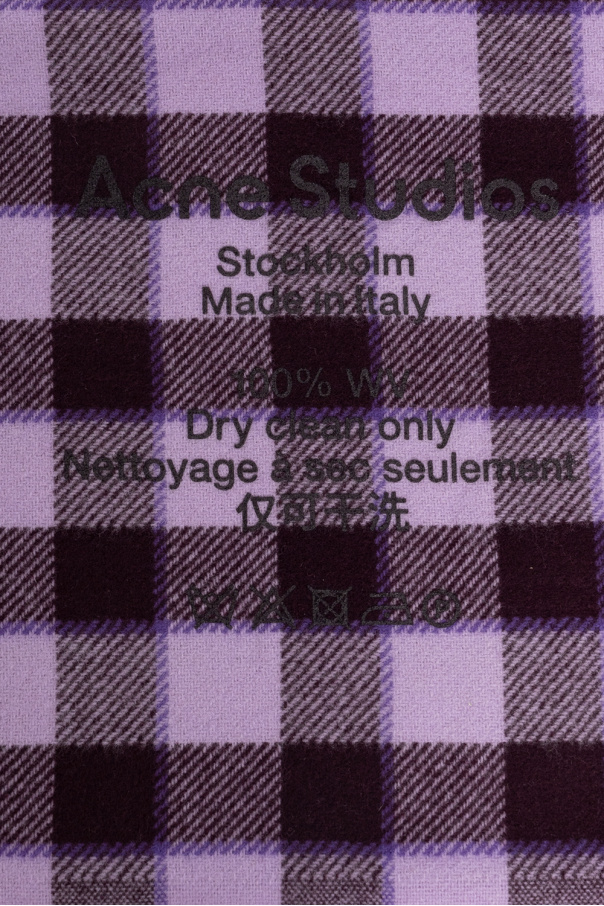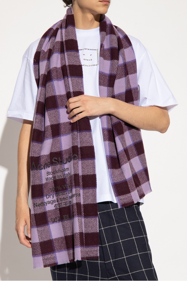 Purple and brown scarf from Acne Studios. Made of wool, this item showcases a check pattern accompanied by a printed black logo.