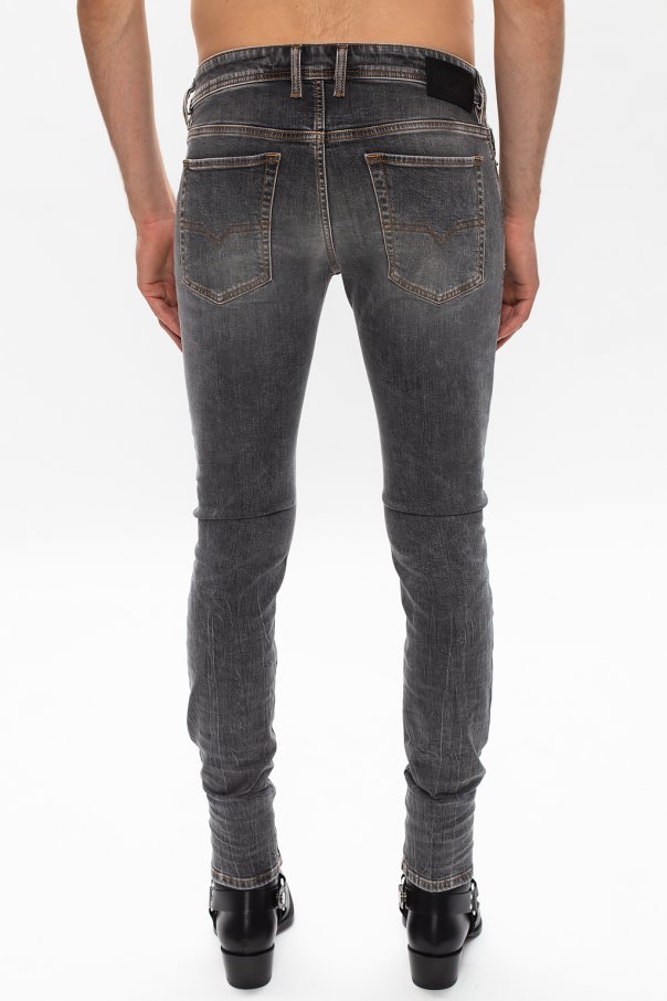 Grey ‘Sleenker-X’ jeans from Diesel. Fastened with buttons. Decorated with a black logo patch and orange stitching details. 3 slip pockets on the front, two at the back. Narrow legs.