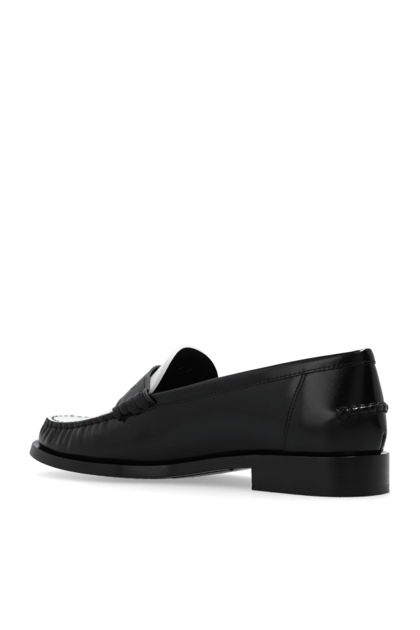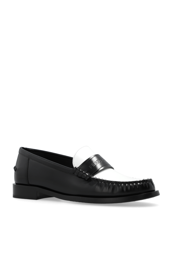 Black and white ‘Irina’ loafers from FERRAGAMO. Made of patent leather, this model sits on a black leather sole and showcases an embossed logo on the front.