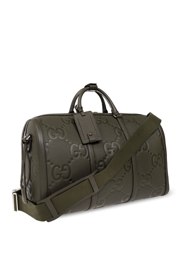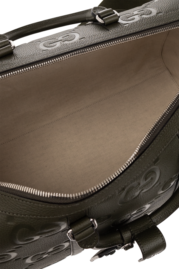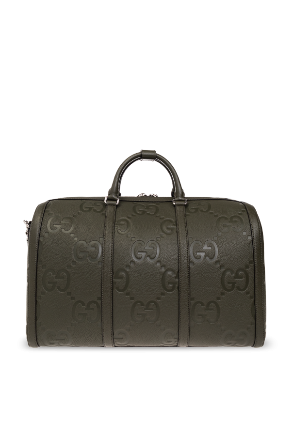 Green duffel bag from Gucci. Crafted from calf leather, this design secures with a two-way zipper and showcases an embossed logo. It is complete with a detachable shoulder strap, two half-round handles, silver-tone metal hardware and one internal compartment with two zip pockets.