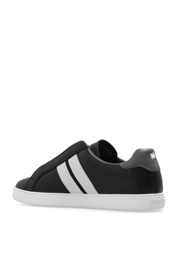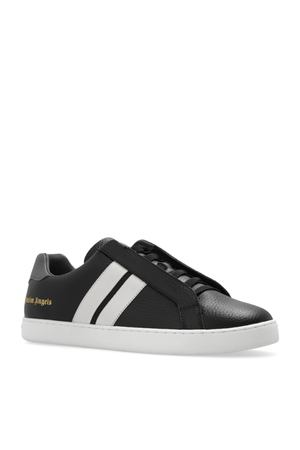 Black sneakers from Palm Angels. Made of leather, this lace-up pair rests on a white rubber sole and is decorated with a logo detail and cream stripes.