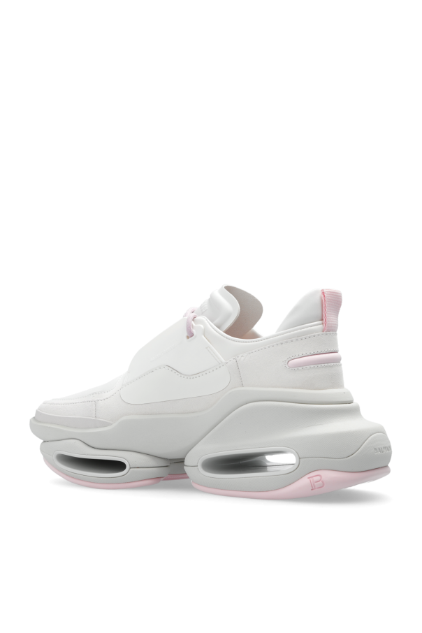 White and grey sneakers from Balmain. Crafted from leather and fabric, this lace-up pair features an embossed logo, blue print and rubber sole in pink and grey.