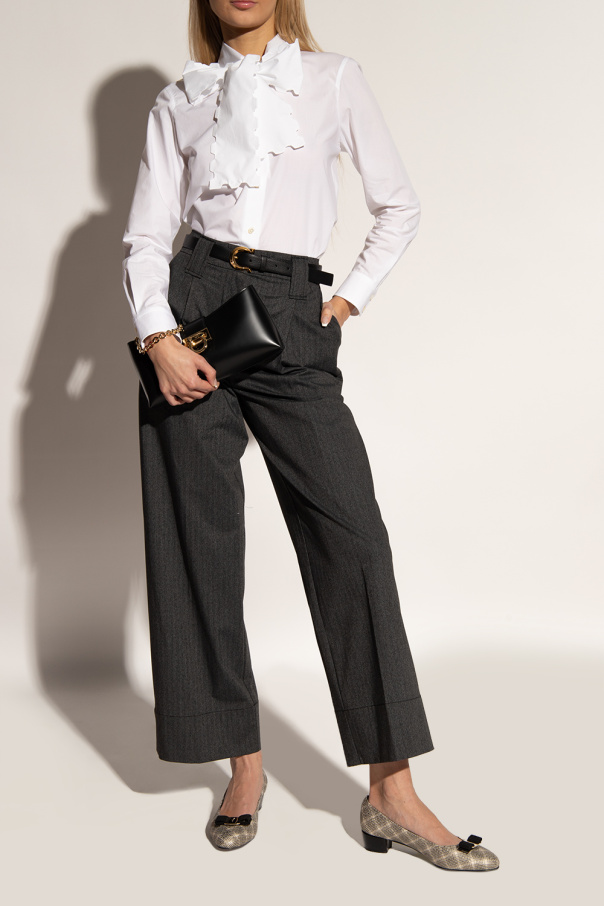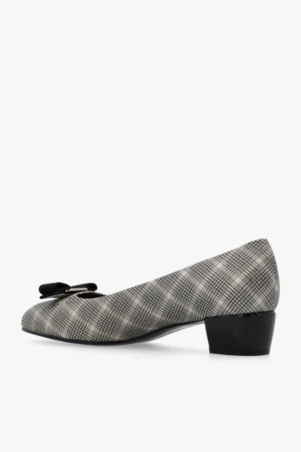 Beige, black and gold-tone ‘Vara’ pumps from FERRAGAMO. Crafted from canvas with a check pattern, this pair is complete with the brand’s signature bow with a logo and black leather sole.