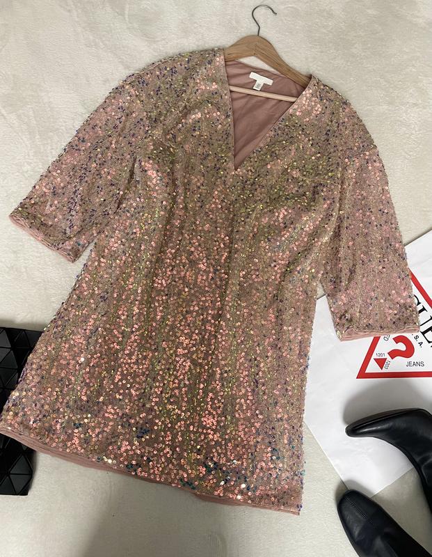Коротке плаття з блискучої сітки з блискітками. V-подібний виріз і рукави 3/4. Підкладка з трикотажу.