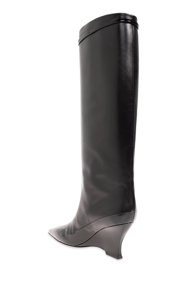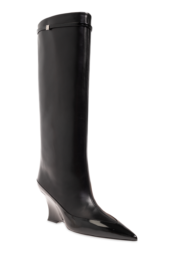 Black ‘Raven’ wedge boots from Givenchy. Made of calf leather in matte and shiny finish, this slip-on pair features a metal 4G logo in silver-tone, pointed toe and black leather sole.